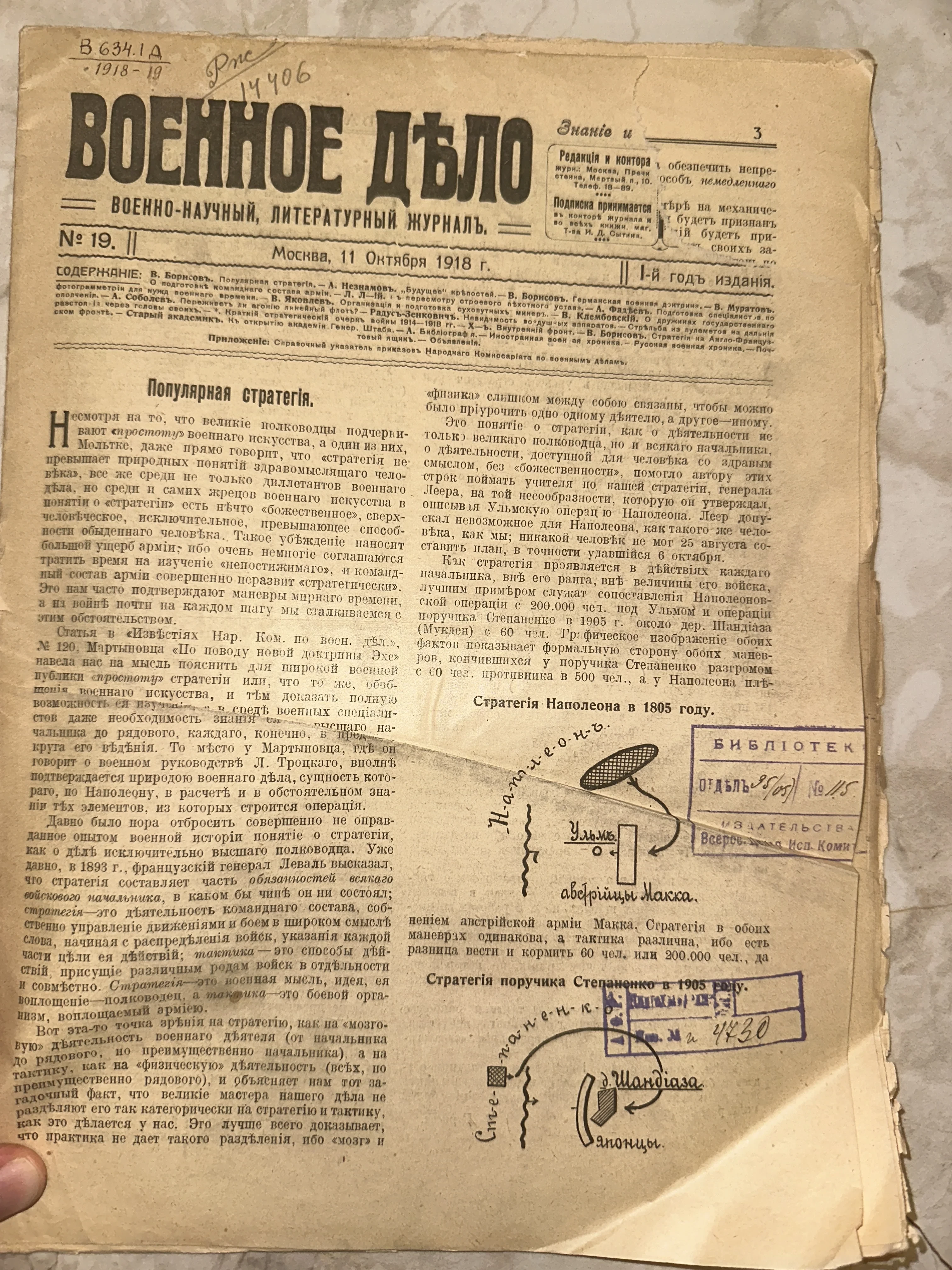 Уникальный экземпляр периодического издания времен Гражданской войны, сохранивший дух переломной эпохи. На пожелтевших страницах представлена статья о военной стратегии с детальными схемами маневров, дополненная аутентичными библиотечными штампами и рукописными пометами. Этот документ представляет исключительный интерес для коллекционеров военной истории и исследователей тактической мысли начала XX века.