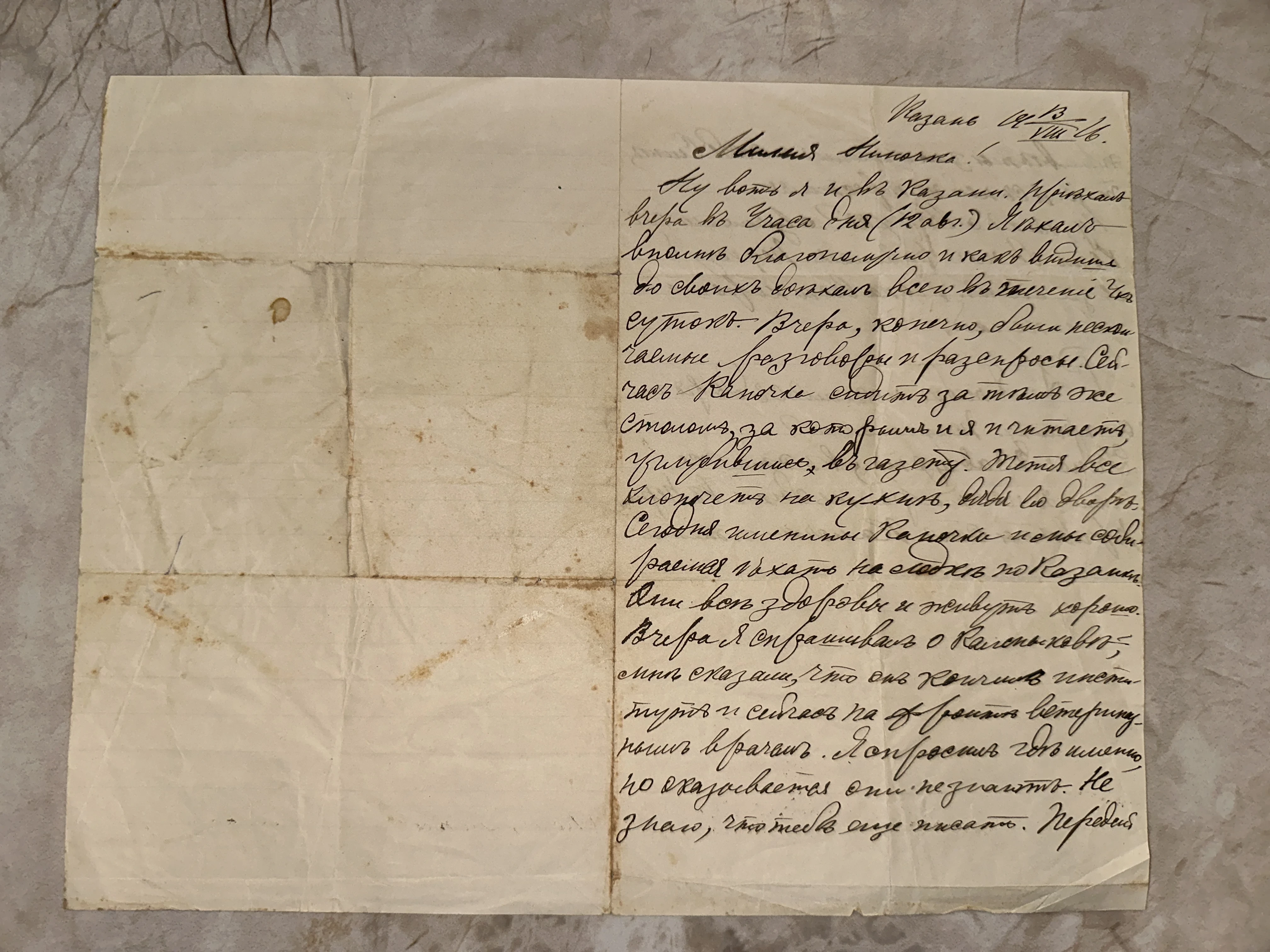 Уникальный документ эпохи Первой мировой войны, написанный из Казани с сохранением старой орфографии. Письмо передает живую атмосферу частной жизни начала XX века, упоминая семейные дела и вести о призыве на фронт. Характерные складки и легкая патина времени делают этот артефакт идеальным дополнением к частной исторической коллекции.