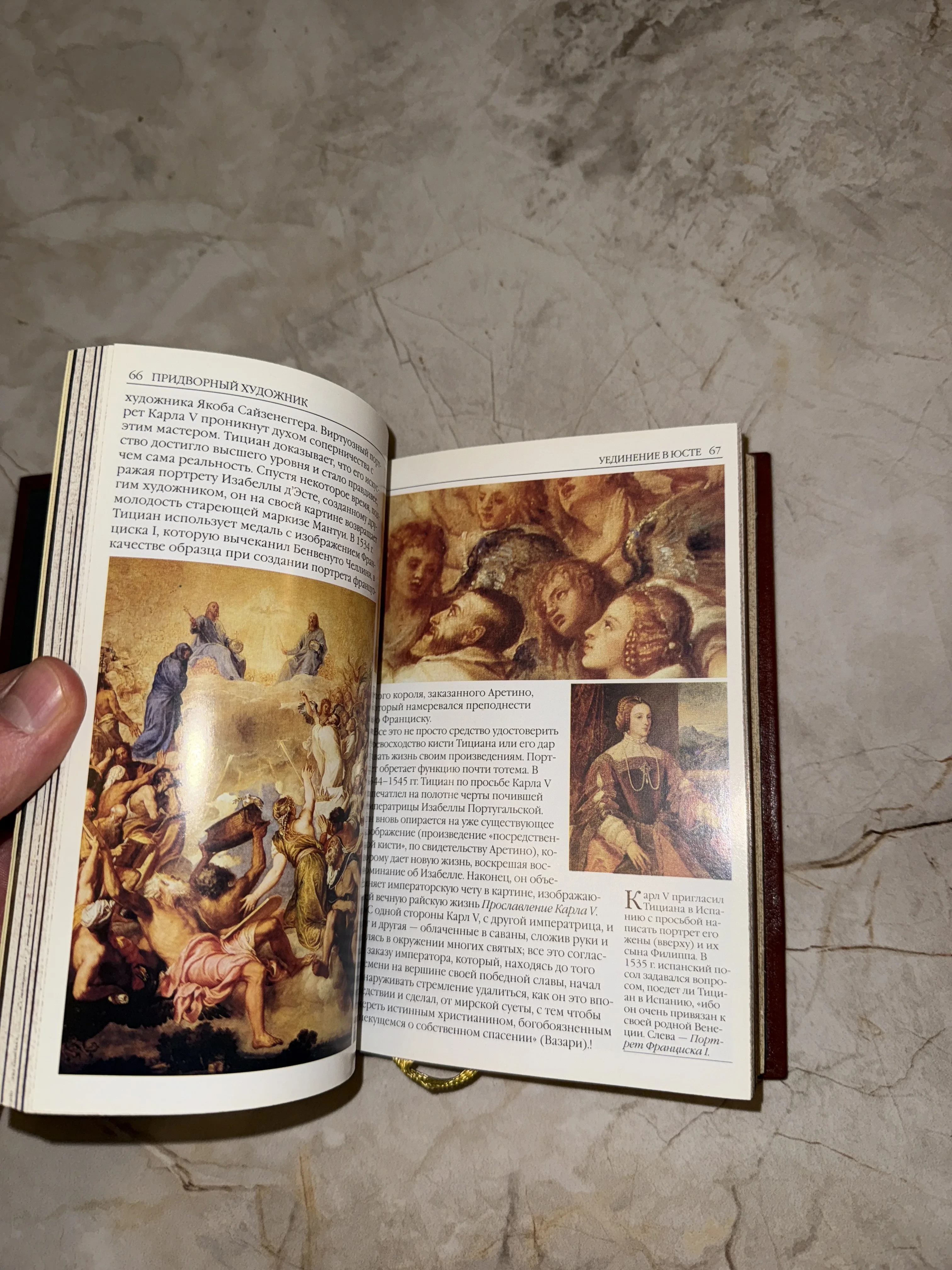 Разворот открытой книги с цветными репродукциями картин Тициана и текстом о придворных художниках XVI века.