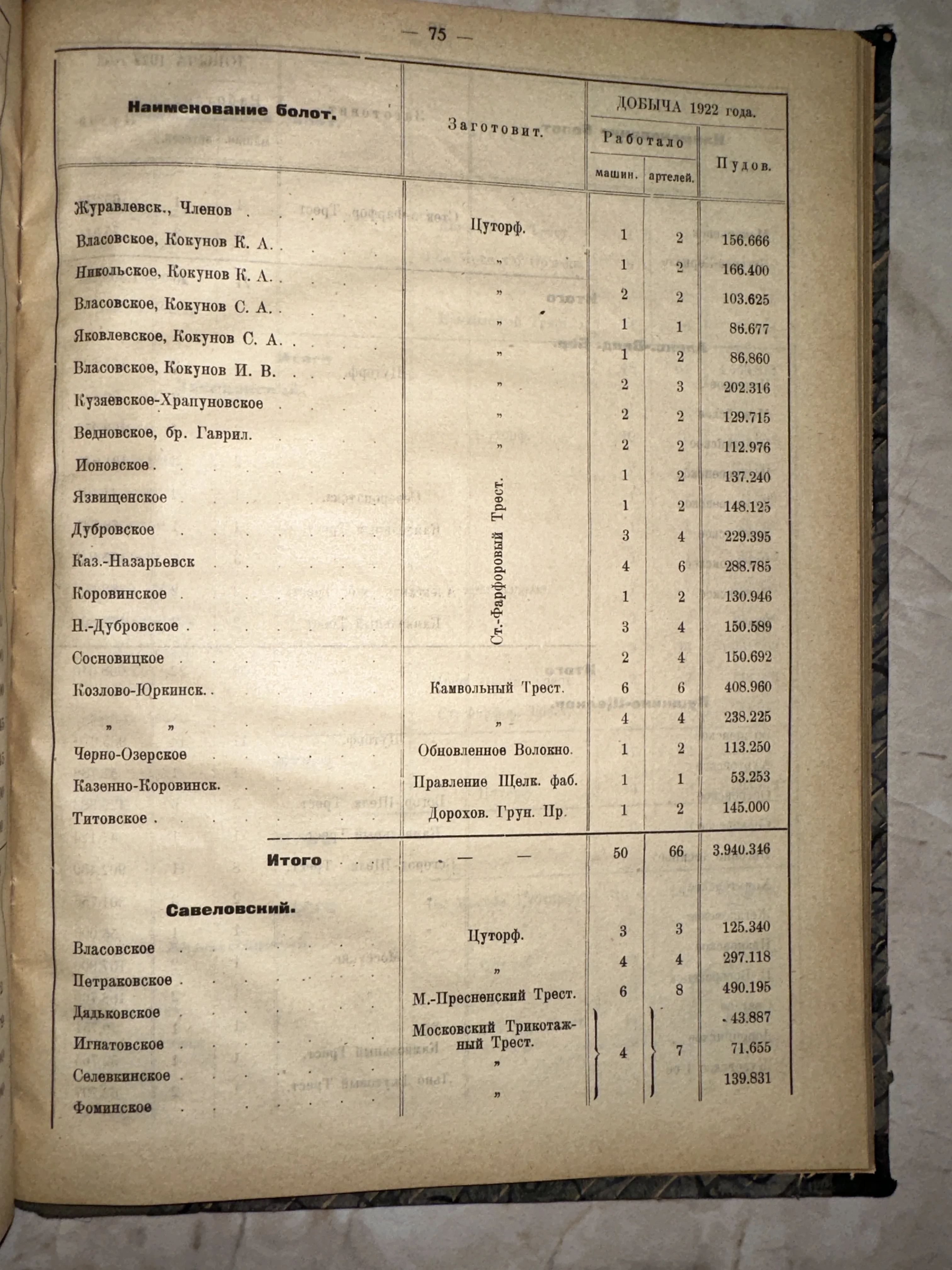 Статистика добычи торфа, 1922 год