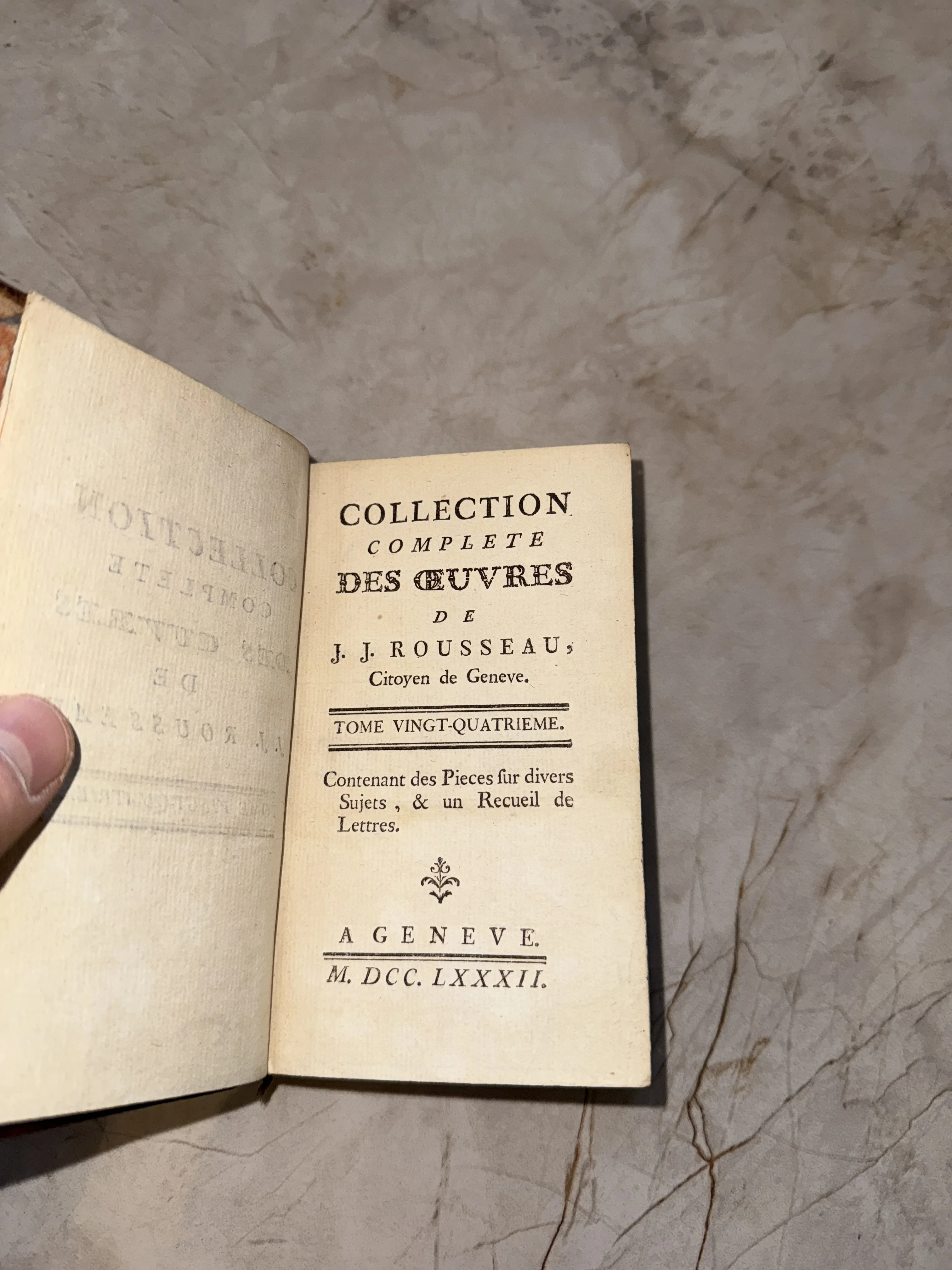 Титульный лист антикварной книги 1782 года на французском языке: Collection Complete des Œuvres de J. J. Rousseau, том 24.