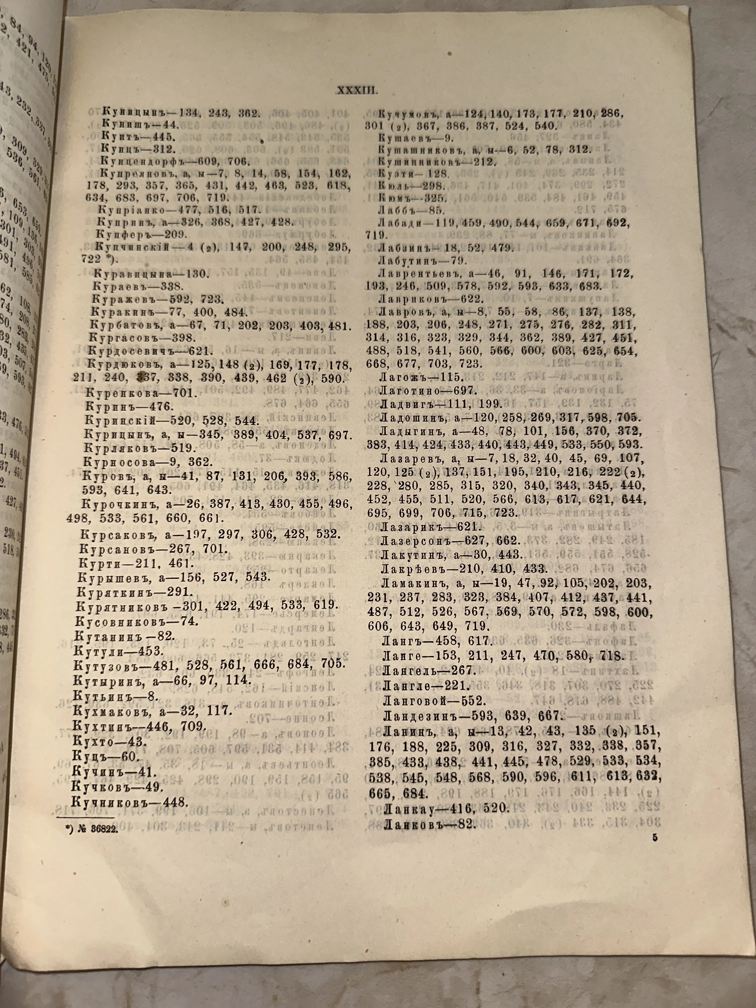 Этот подлинный лист из дореволюционного издания представляет собой детальный именной указатель, выполненный на характерной пожелтевшей бумаге. Состояние текста превосходное: четкая типографская печать и аутентичный шрифт передают строгую эстетику архивных документов рубежа веков. Идеальный предмет для оформления тематических интерьеров или пополнения коллекции старинной полиграфии.