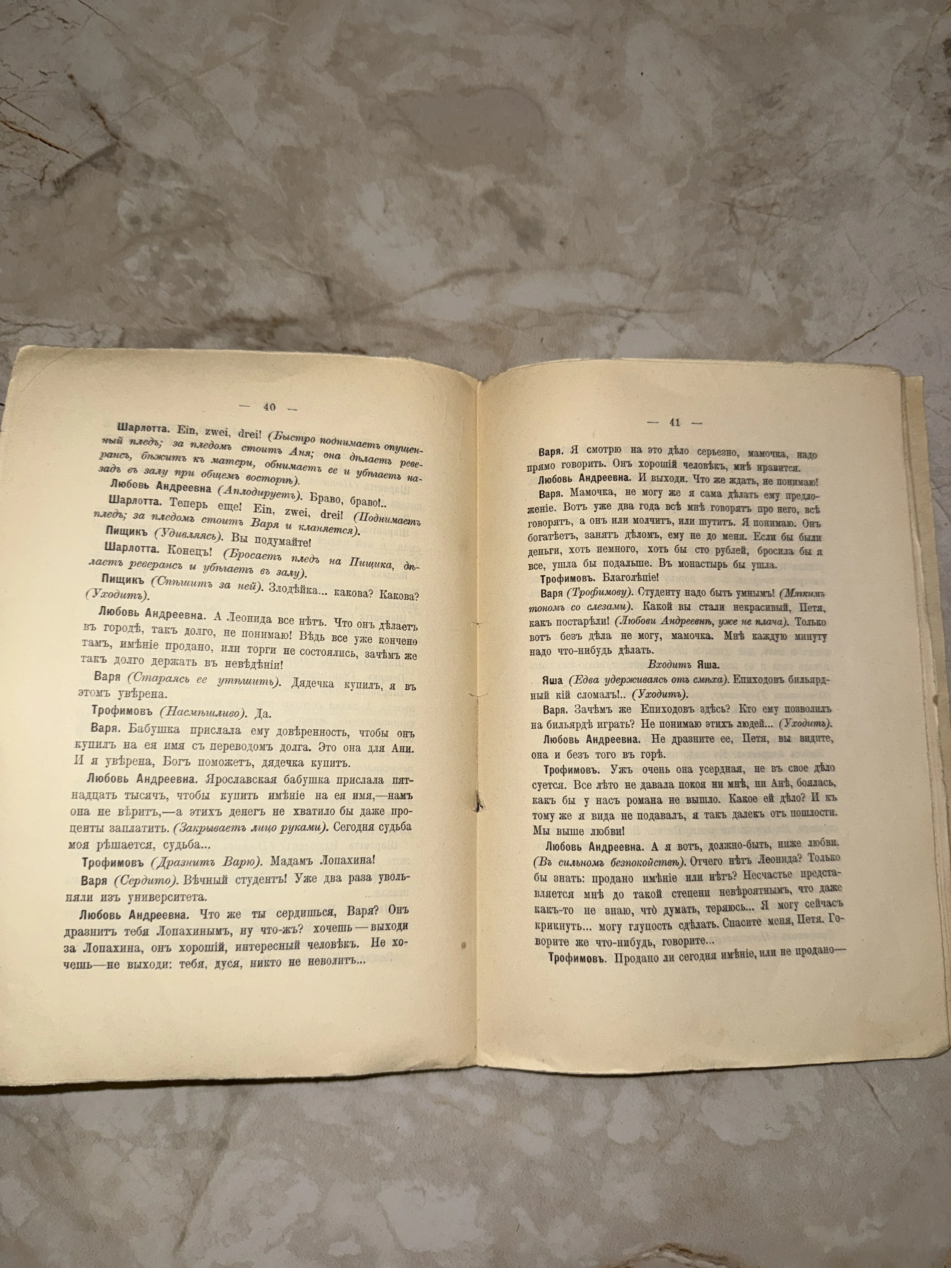 Разворот старинной книги со страницами пьесы Антона Чехова, напечатанной в дореволюционной орфографии.