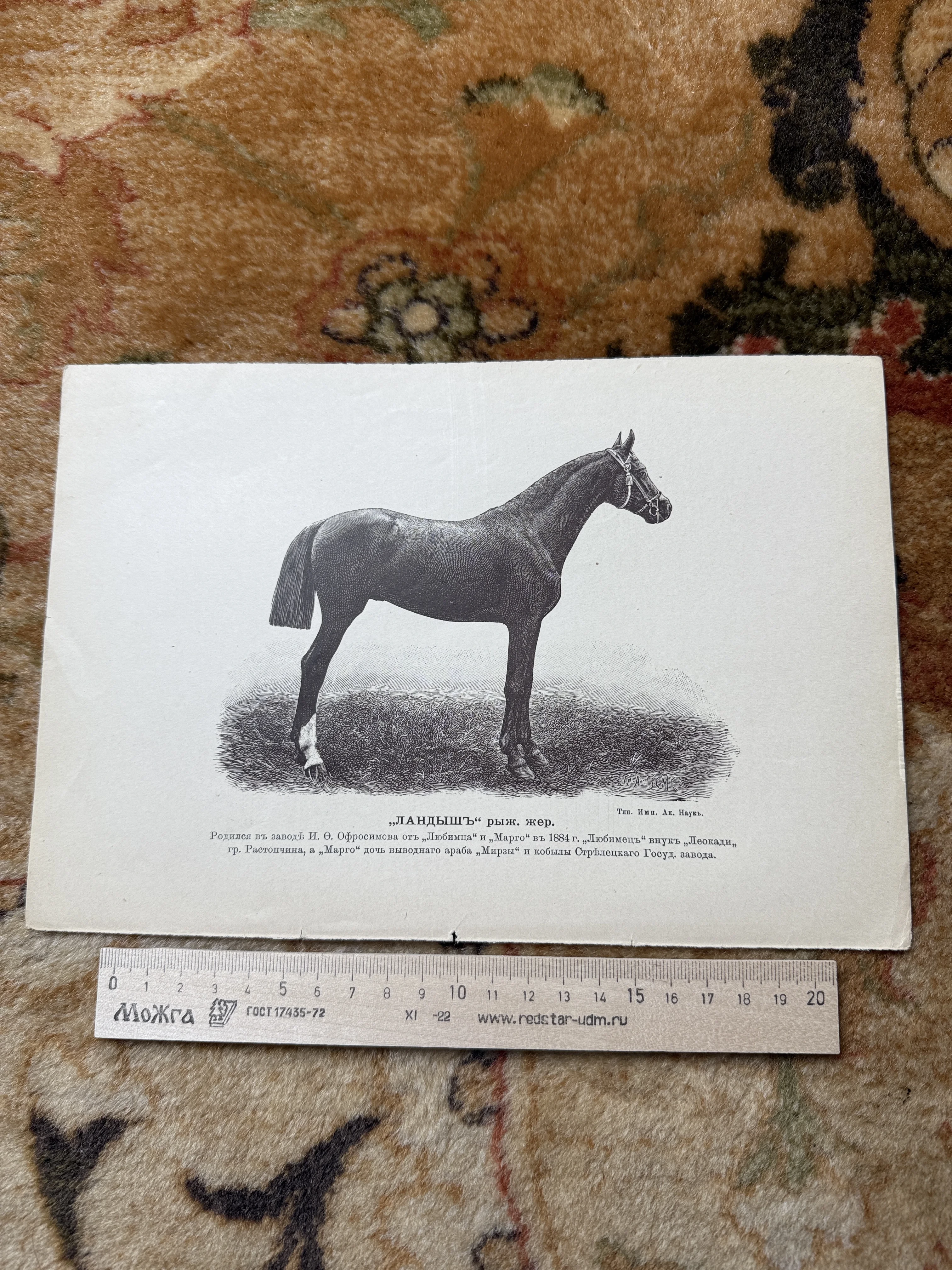 Изящная литография конца XIX века, отпечатанная в типографии Императорской Академии Наук, детально фиксирует экстерьер знаменитого рыжего жеребца Ландыша. Тончайшая штриховка мастерски передает мускулатуру и благородную стать животного, делая этот лист ценным не только для историков коннозаводства, но и для ценителей русской графики. Состояние бумаги превосходное, с легким налетом времени, что лишь подчеркивает подлинность и антикварный шарм предмета.