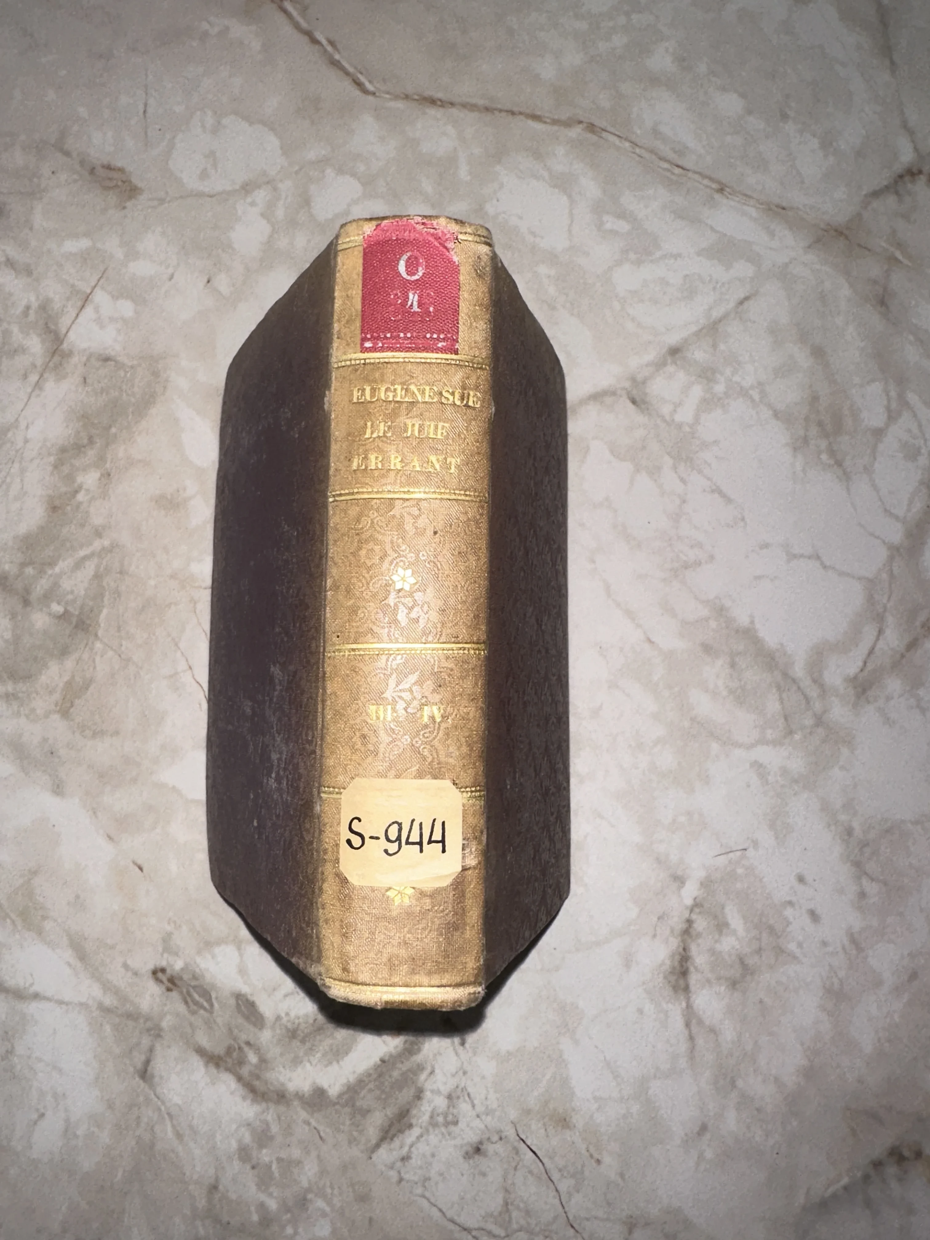 Благородный золоченый корешок французского романа XIX века с изящным растительным орнаментом и следами времени. Характерные потертости и старая библиотечная метка придают этому экземпляру особую историческую достоверность и шарм антикварного артефакта.