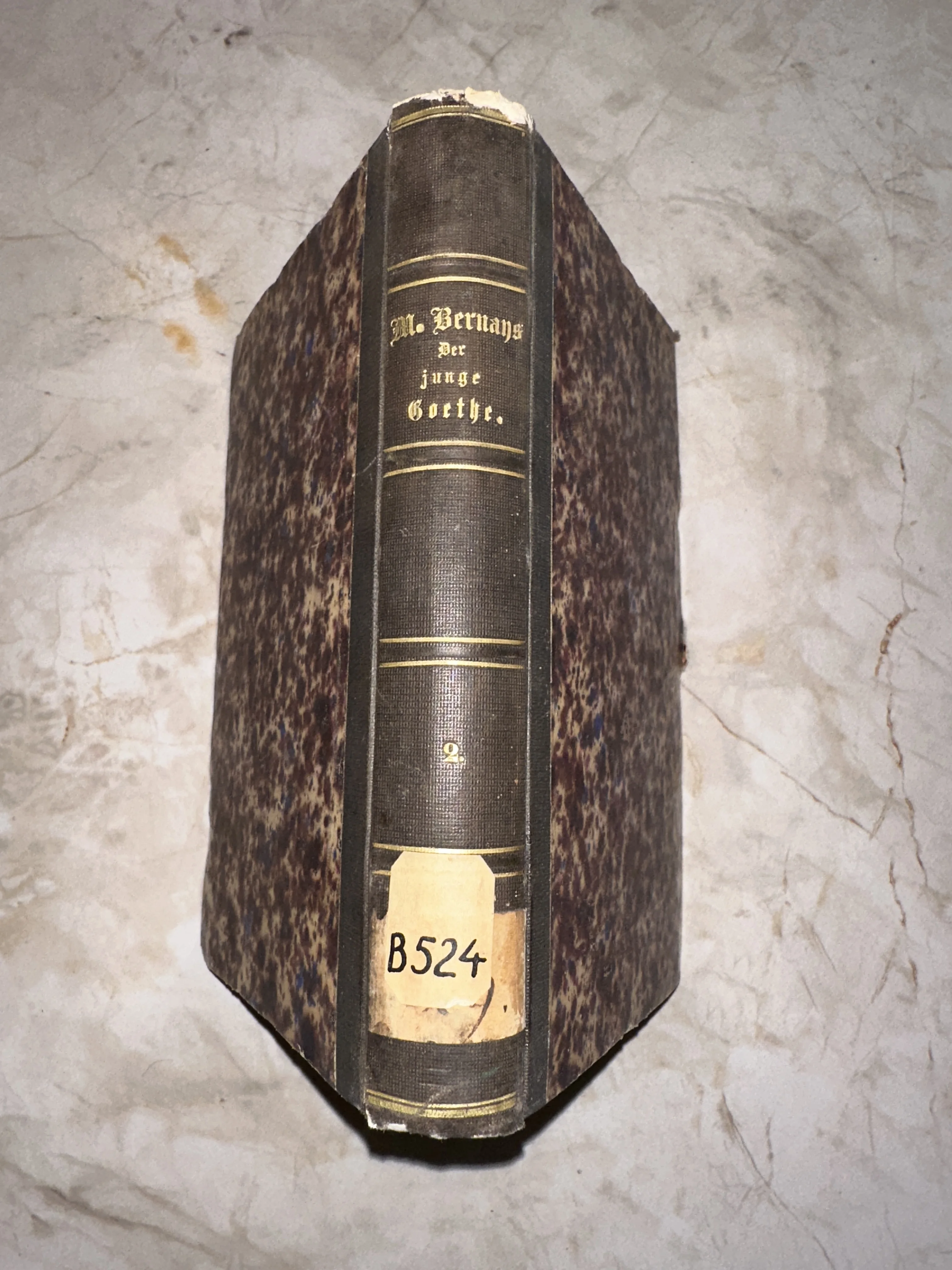 Корешок и обложка старинной книги на немецком языке под названием Der junge Goethe авторства M. Bernays с мраморным узором.