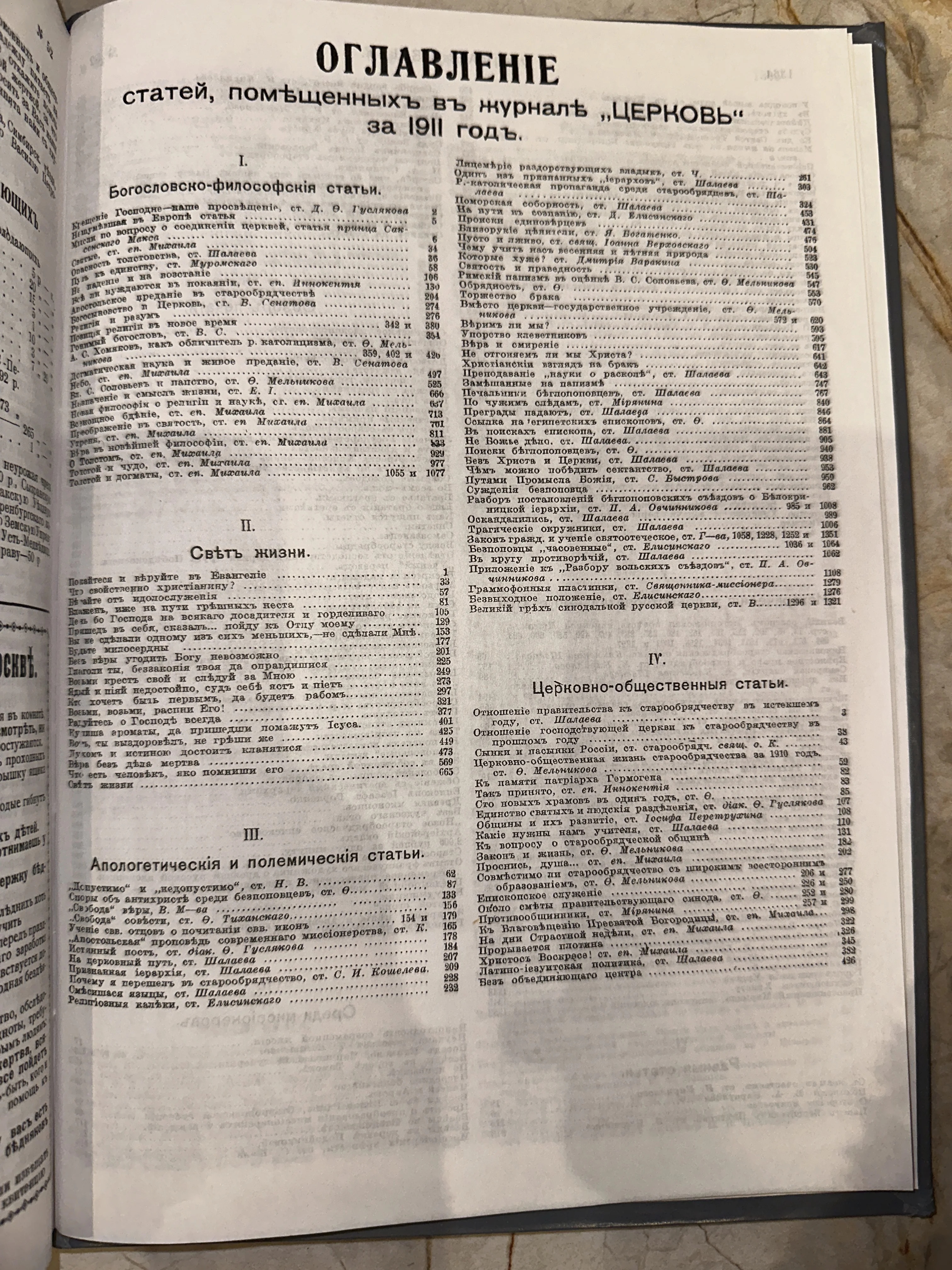 Оглавление журнала «Церковь», 1911 год