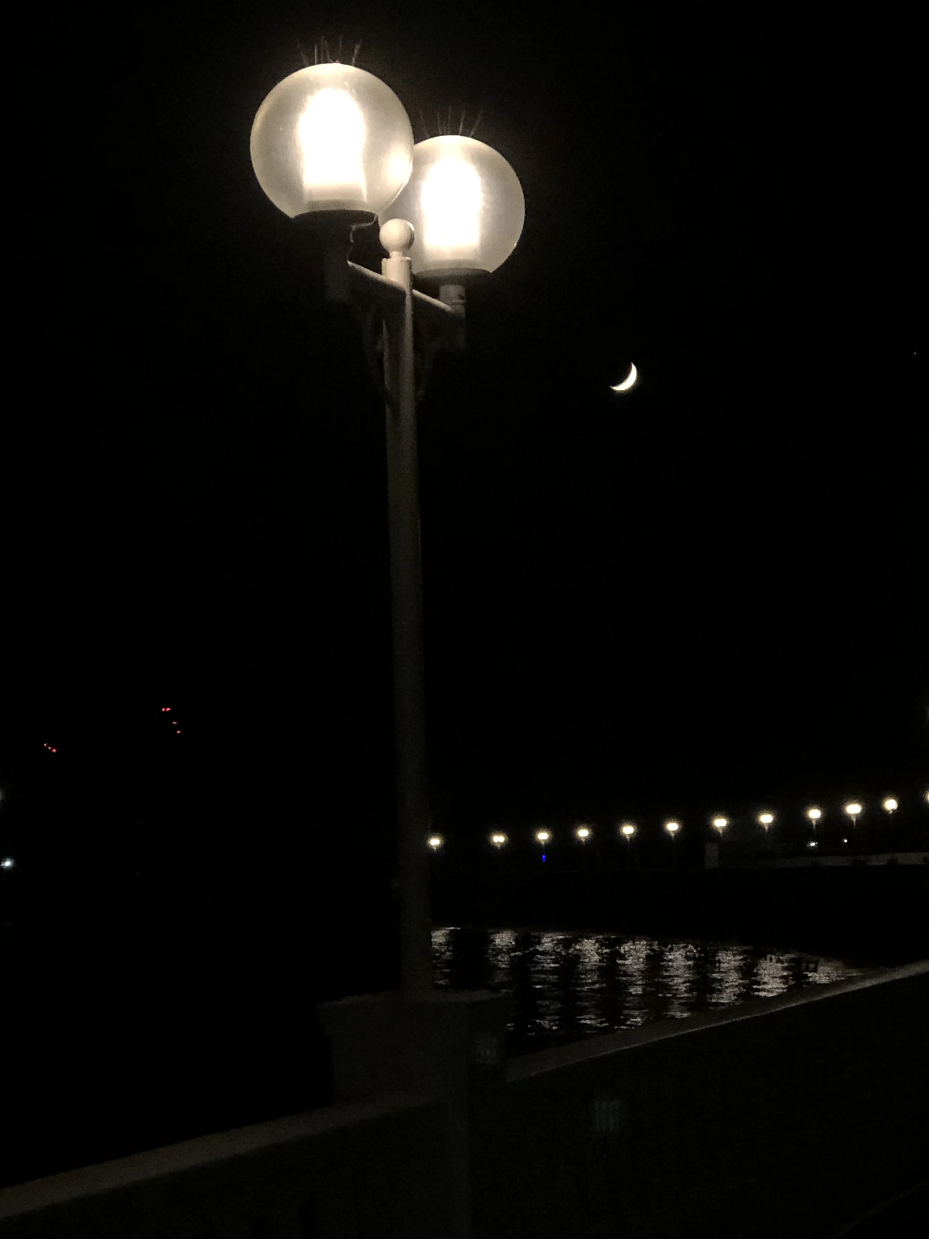 Поэтичный вид ночной набережной, где мягкий свет парных плафонов контрастирует с тонким серпом луны в глубоком черном небе. Цепочка далеких огней, мерцающих на водной глади, создает атмосферу меланхоличного спокойствия и городского романтизма. Снимок мастерски передает магию ночного одиночества и вневременную эстетику спящего города.