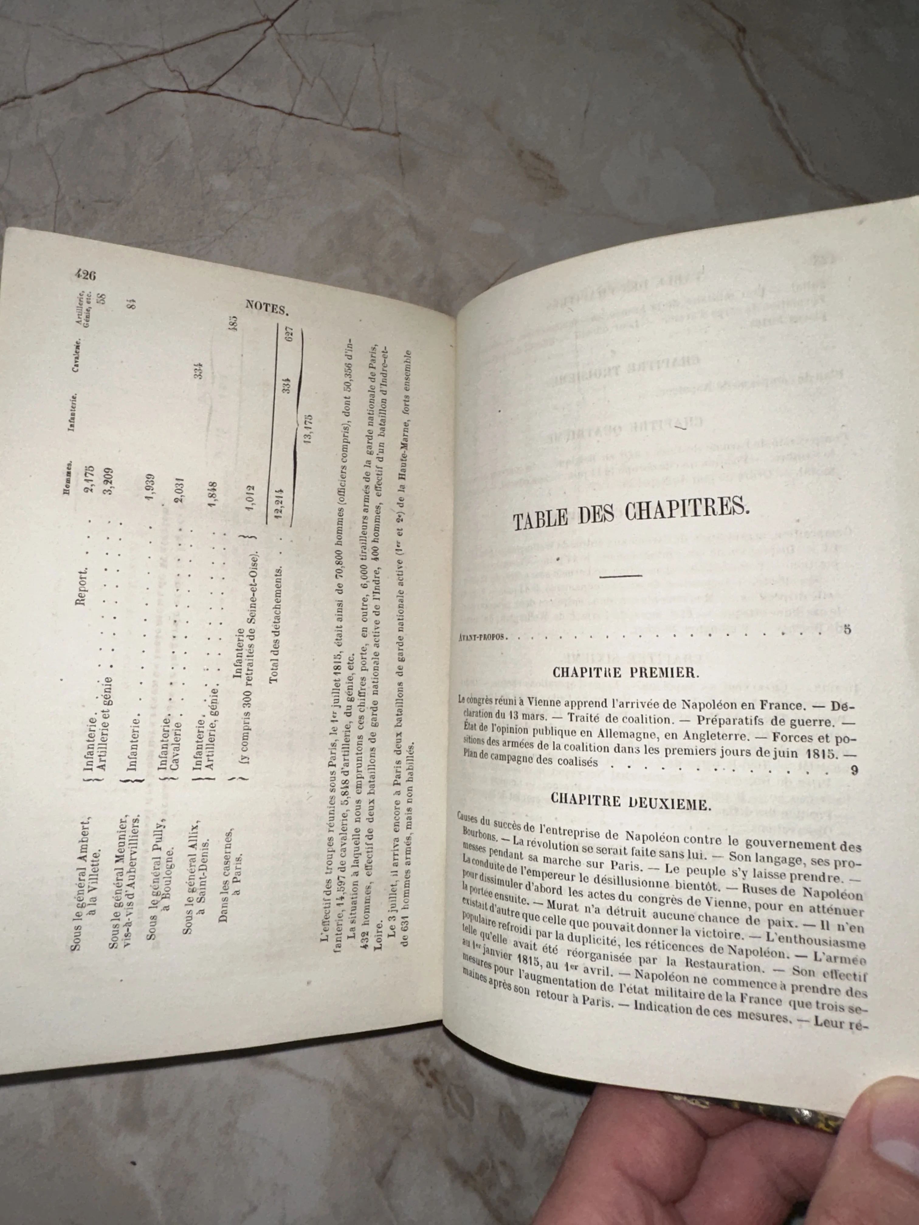Уникальное историческое свидетельство эпохи Наполеона, содержащее подробные сведения о дислокации и составе французских войск в 1815 году. Плотные пожелтевшие страницы с четкой типографской печатью и аккуратными таблицами передают строгую атмосферу военных архивов XIX века. Прекрасно сохранившийся образец антикварной литературы для истинных ценителей военной истории.