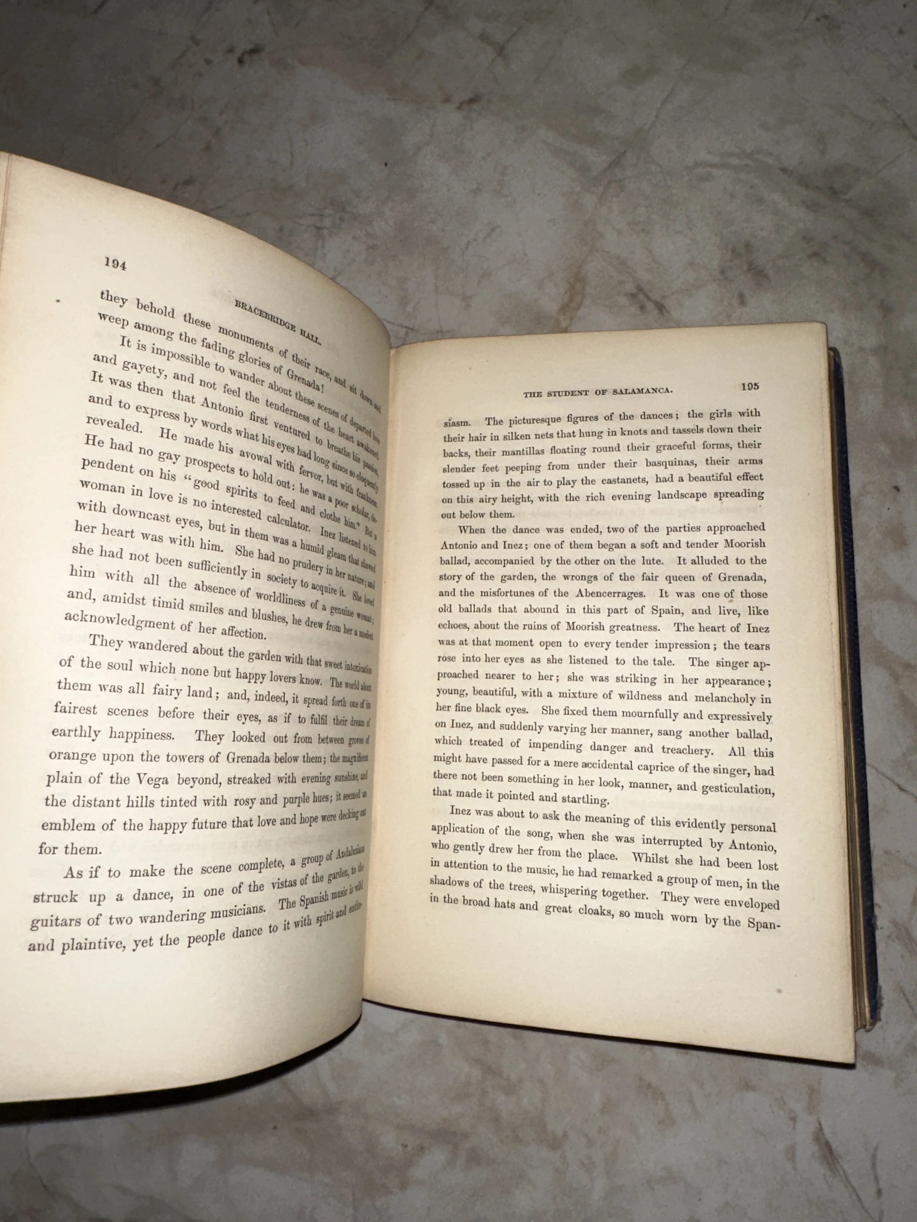 Разворот старинной книги на английском языке с заголовками Bracebridge Hall и The Student of Salamanca на пожелтевшей бумаге.