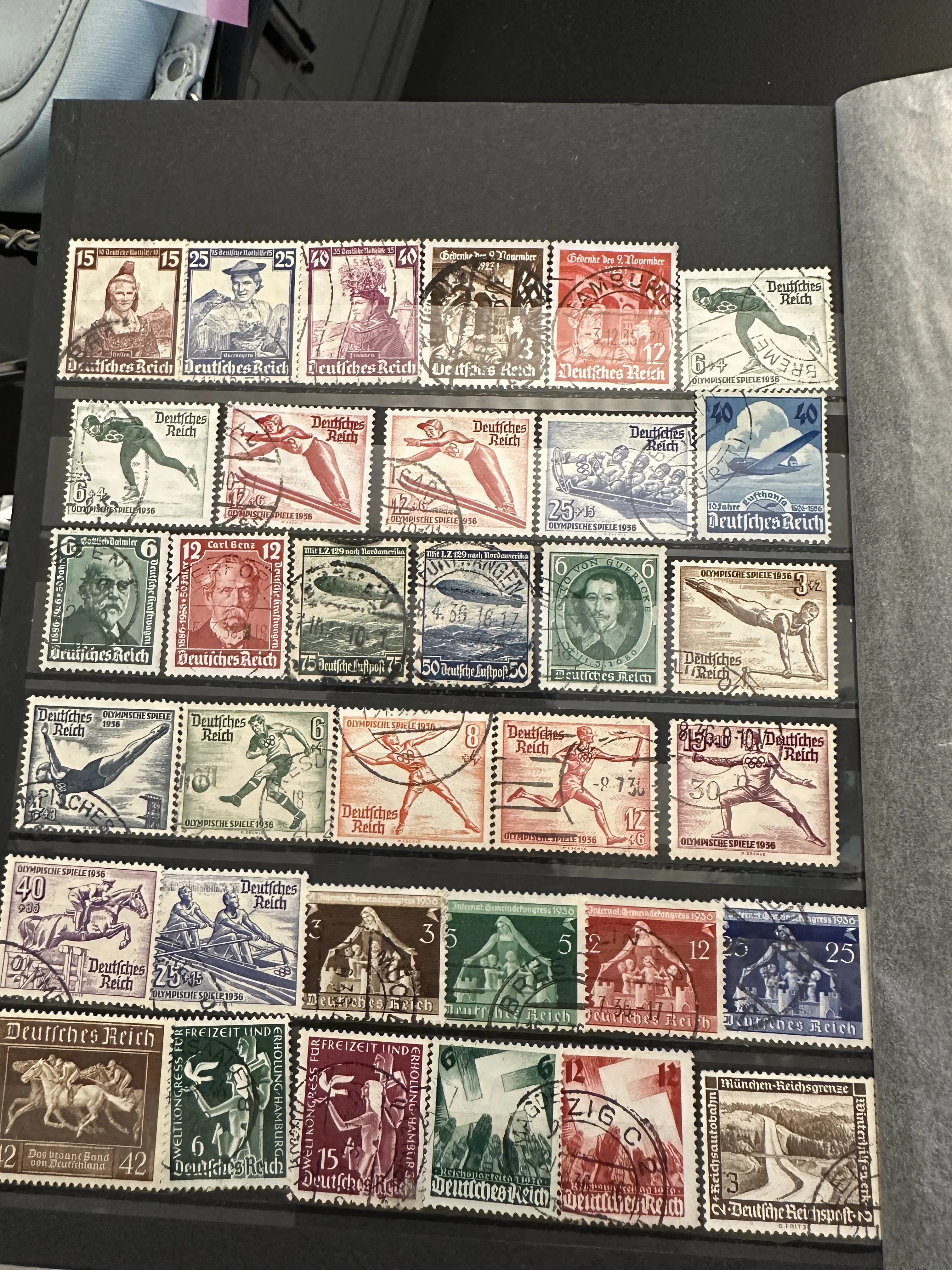 Страница альбома-кляссера с немецкими почтовыми марками, включая серии, посвященные Олимпийским играм 1936 года, дирижаблям и известным личностям.