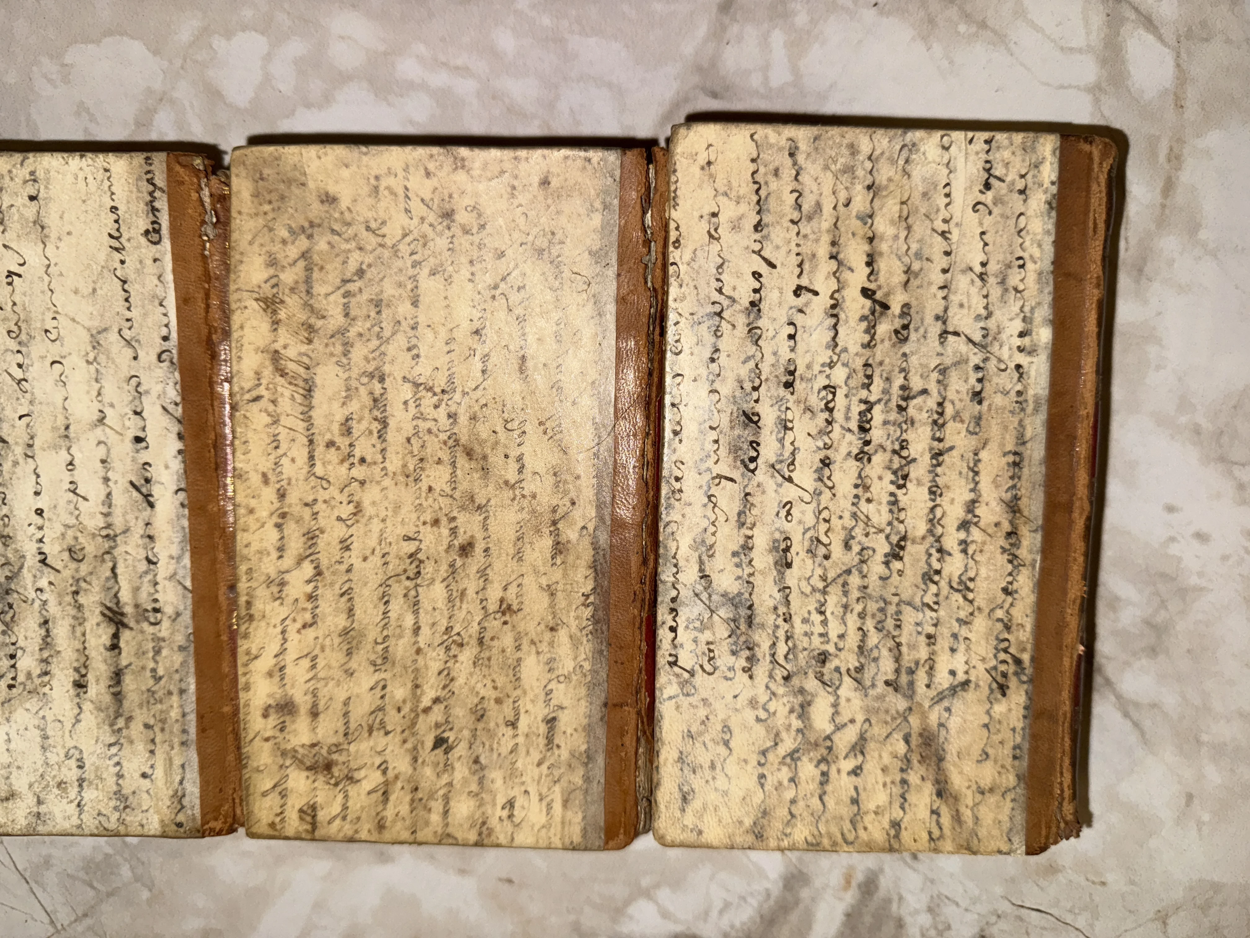 Уникальный образец частной переписки или дневниковых записей, оформленный в виде изящных миниатюрных томов. Пожелтевшая от времени бумага и выцветшие чернила хранят в себе тайны прошлого, а потертые кожаные корешки подчеркивают почтенный возраст этого редкого артефакта. Идеальный предмет для коллекции редких манускриптов и изучения старинной каллиграфии.