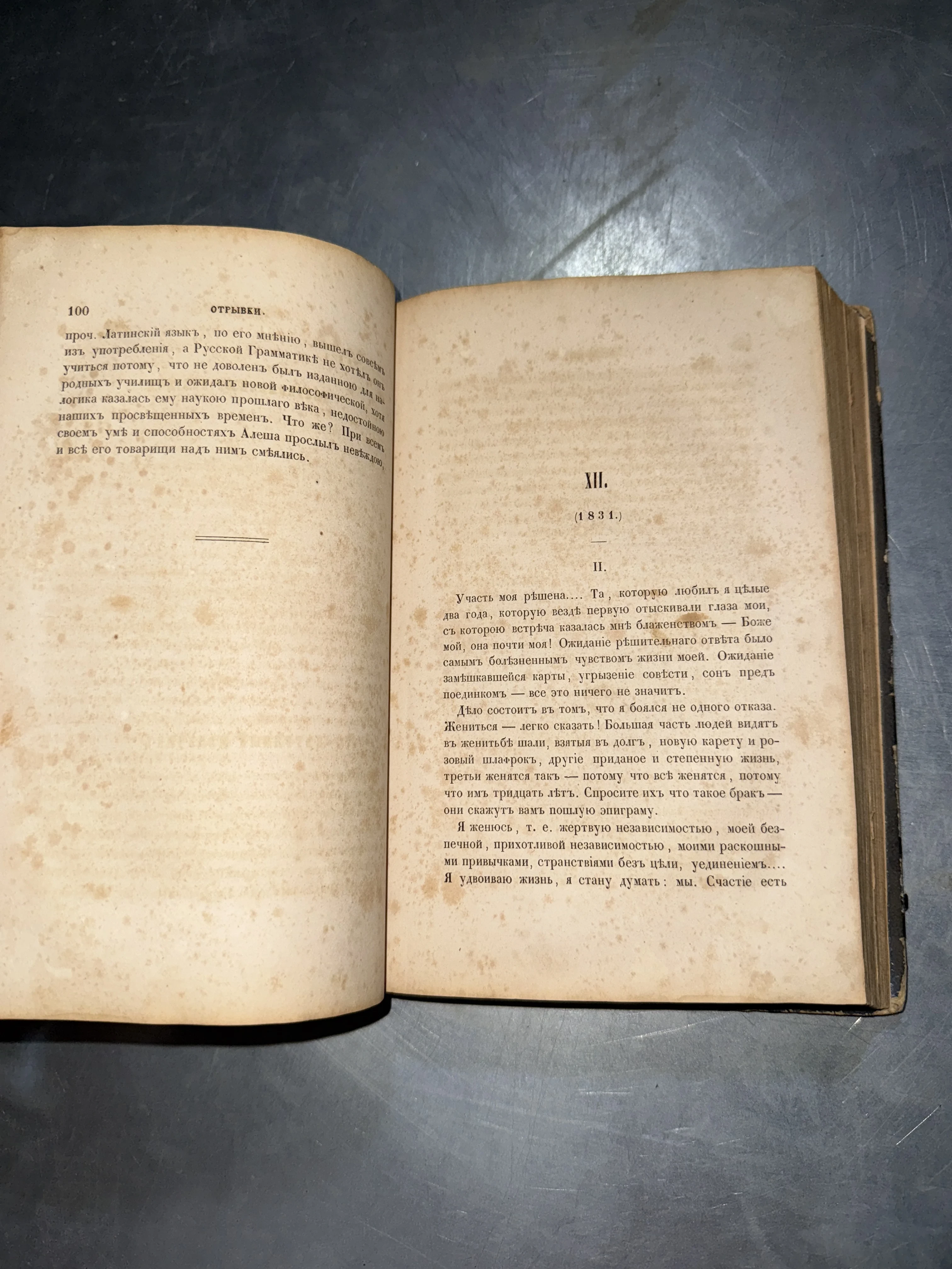 Перед вами подлинный свидетель эпохи — открытый разворот редкого издания с характерным шрифтом и орфографией XIX века. Благородная патина времени, выраженная в пожелтевших страницах и легком фоксинге, подчеркивает историческую ценность и аутентичность этого экземпляра. Текст, датированный 1831 годом, приглашает прикоснуться к живой истории русской литературы в её первозданном виде.