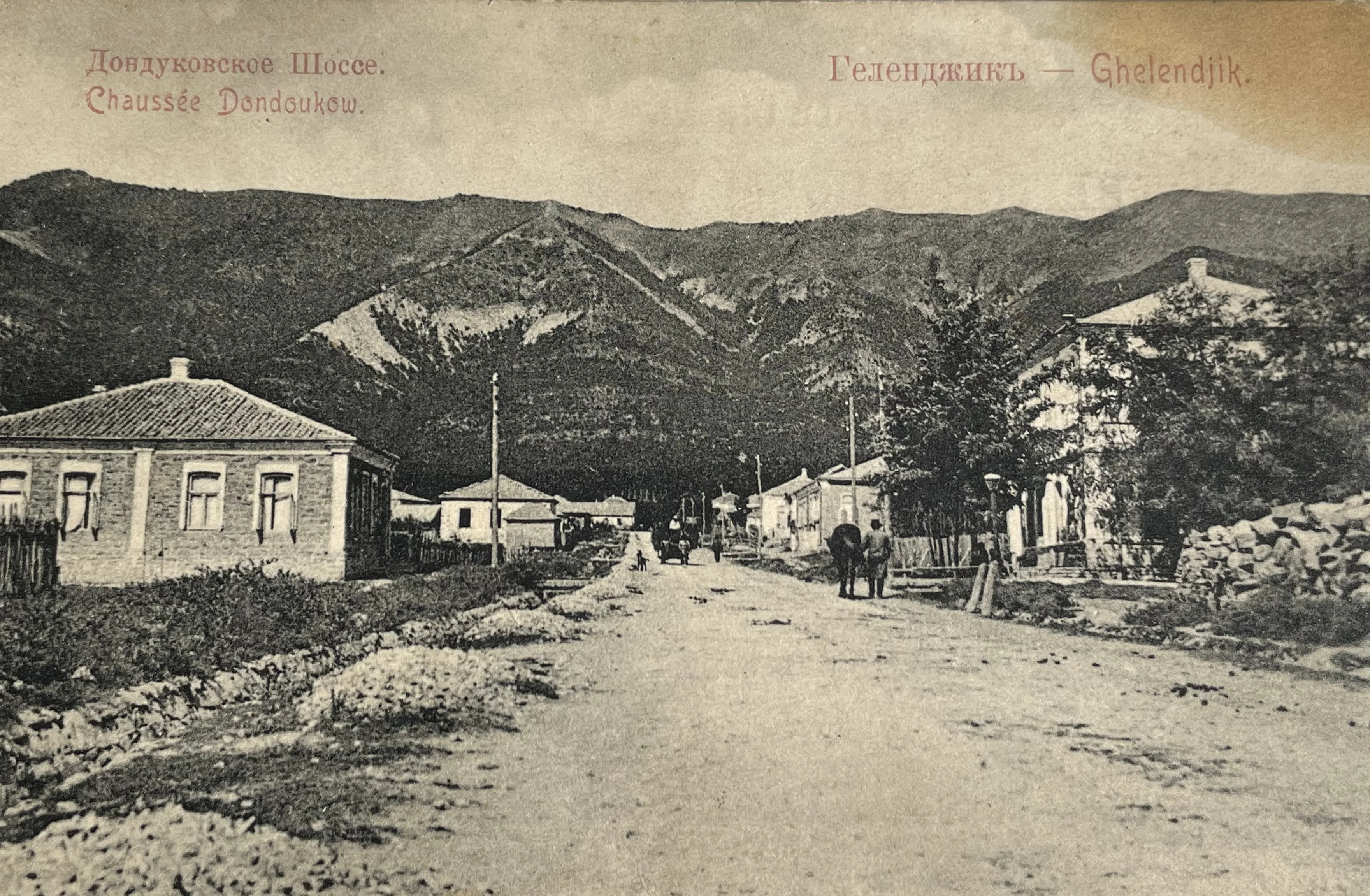 Старинная черно-белая открытка с видом на Дондуковское шоссе в Геленджике на фоне гор, начало XX века.