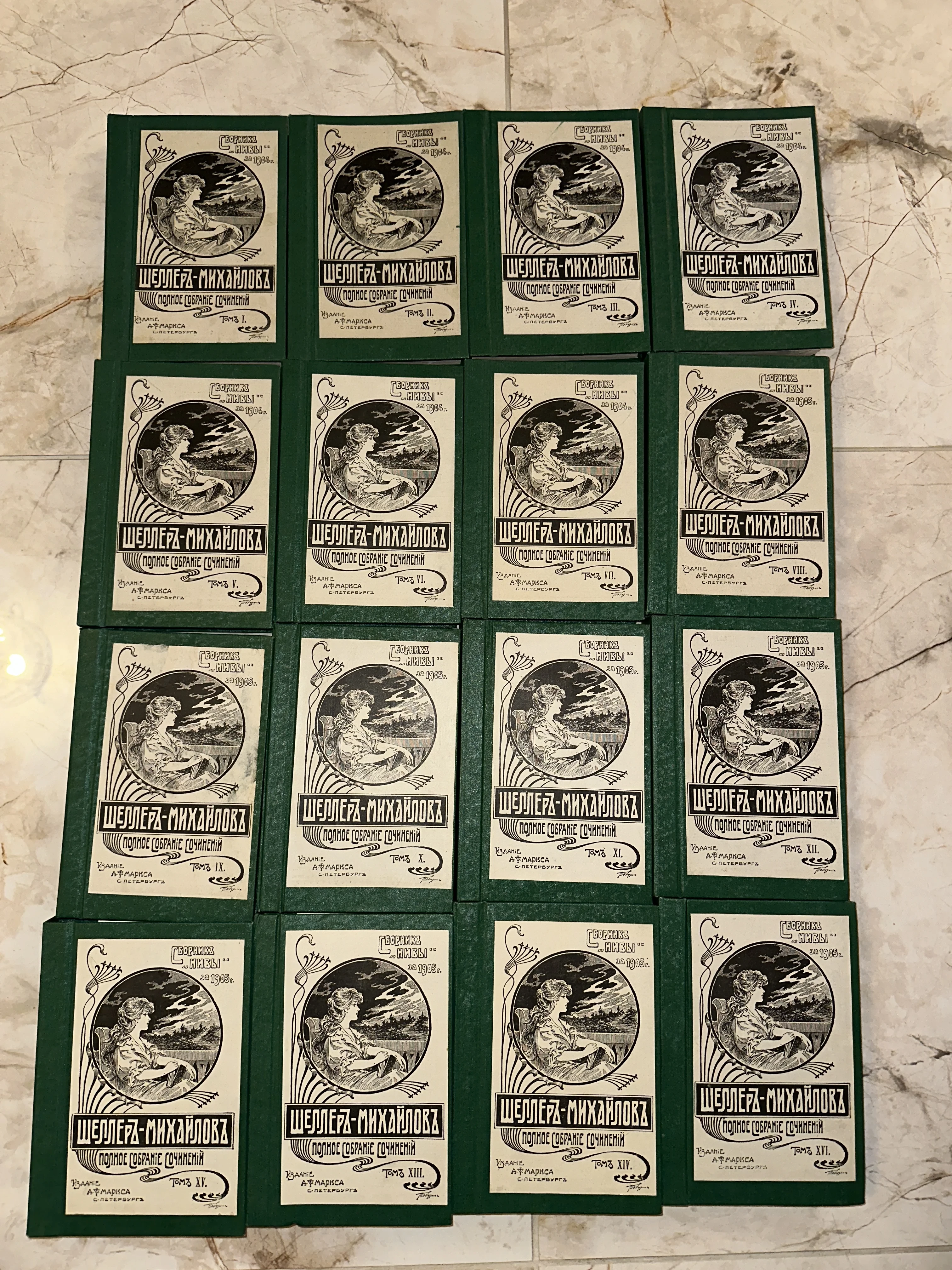 Редкий полный комплект сочинений А. К. Шеллера-Михайлова, изданный легендарным А. Ф. Марксом в начале XX века как приложение к журналу «Нива». Каждая обложка украшена изысканной иллюстрацией в стиле модерн, передающей атмосферу Серебряного века и эстетику дореволюционной России. Коллекционное состояние и благородный зеленый коленкор делают этот набор жемчужиной любой антикварной библиотеки.