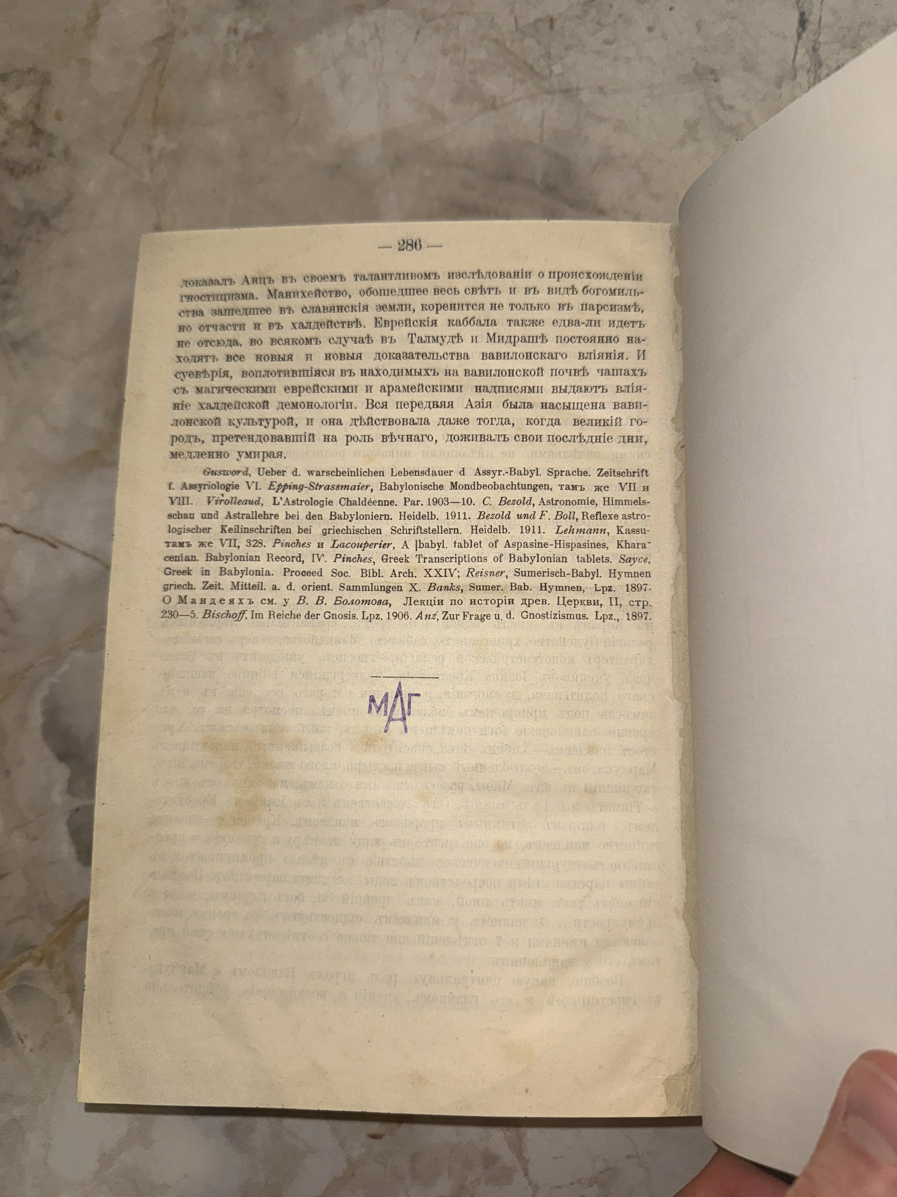 Эта редкая страница из научного труда начала XX века посвящена глубокому изучению мистических учений: от гностицизма до вавилонской демонологии. Благородная патина времени, пожелтевшая бумага и оригинальный штамп придают экземпляру особую коллекционную аутентичность. Текст, напечатанный в дореволюционной орфографии, приглашает исследователя окунуться в мир забытых религиозных тайн.