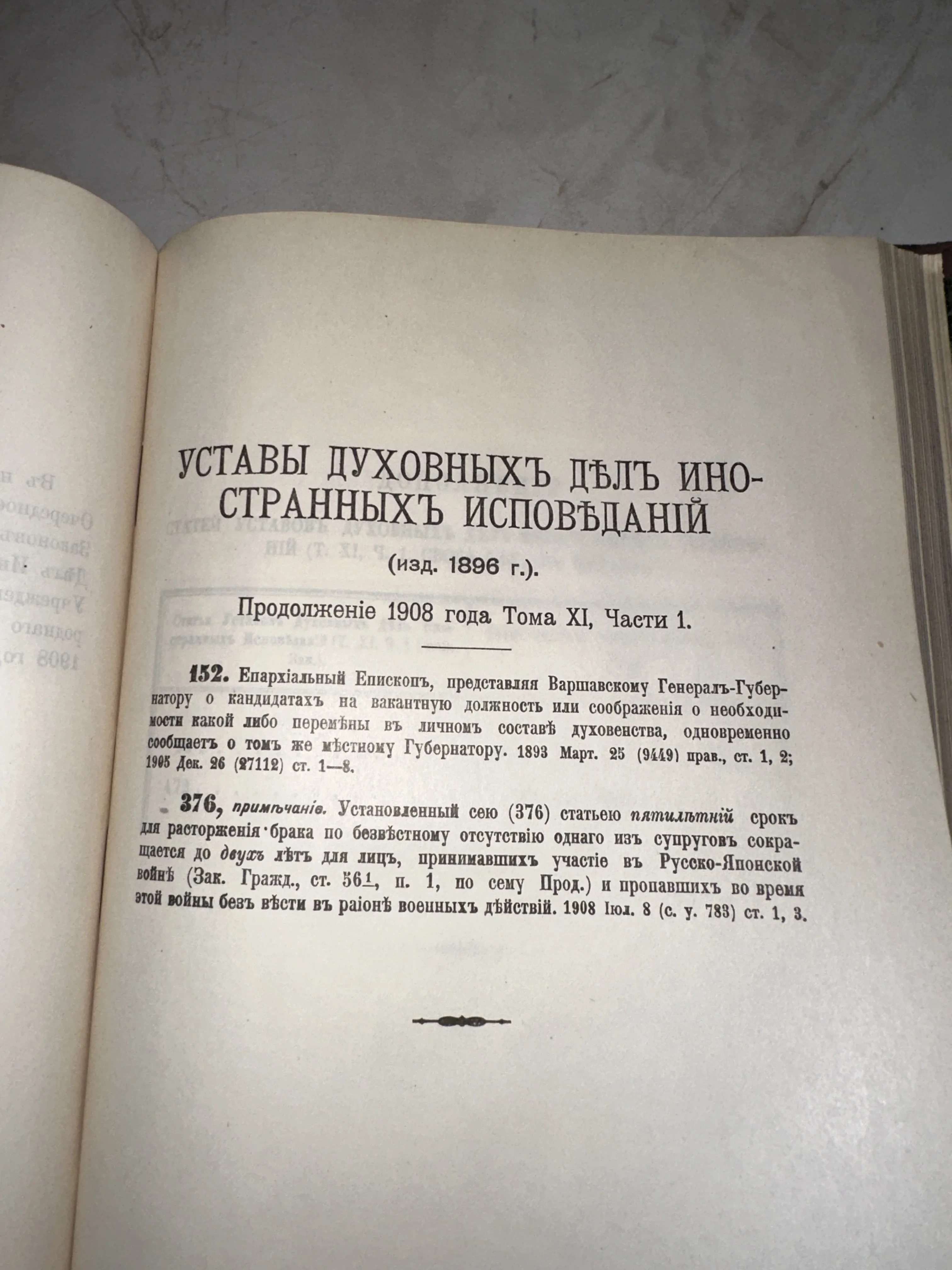 Редкое юридическое свидетельство эпохи, регламентирующее сложный мир религиозных и гражданских отношений в Российской империи начала XX века. Страницы сохранили благородную патину времени и четкий типографский шрифт, а содержание включает уникальные правки времен Русско-японской войны. Этот экземпляр станет ценным дополнением коллекции для историков права и ценителей церковной старины.