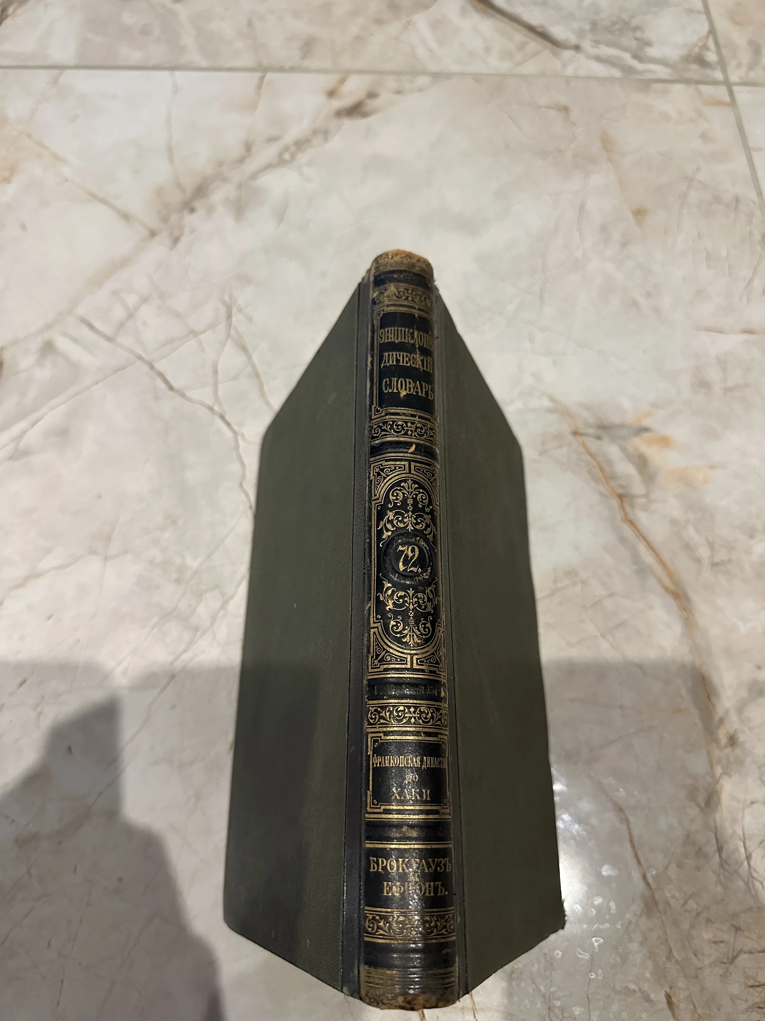 Корешок антикварной книги «Энциклопедический словарь Брокгауза и Ефрона» с золотым тиснением и орнаментом, том 72.