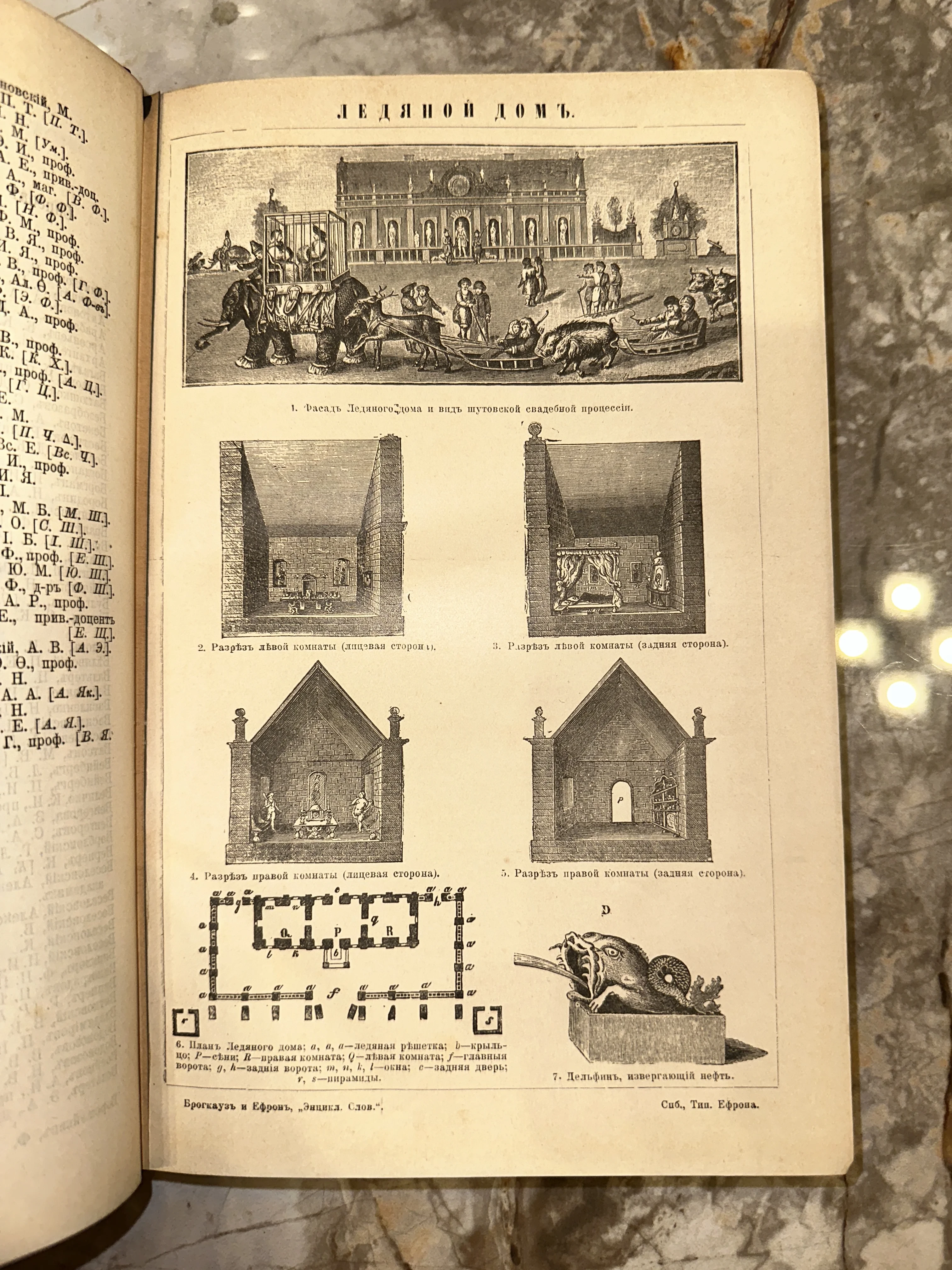 Редкая книжная иллюстрация, детально воссоздающая облик знаменитого Ледяного дома Анны Иоанновны. На листе представлены искусные гравюры с изображением свадебной процессии, архитектурных разрезов и даже знаменитого ледяного дельфина, извергающего нефть. Превосходная четкость печати и историческая значимость делают этот фрагмент энциклопедии ценным экспонатом для тематической коллекции.
