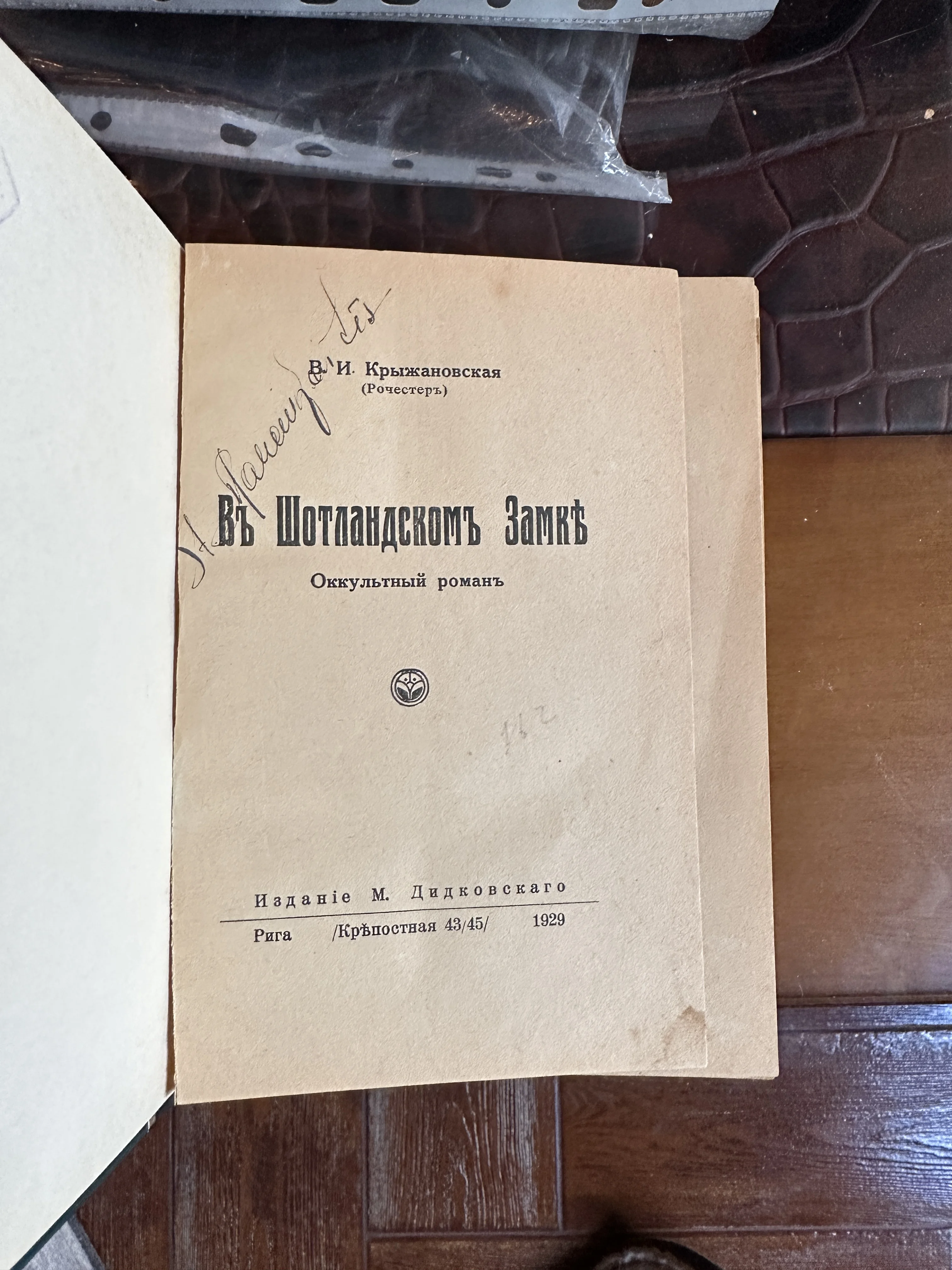 Редкое рижское издание мистического романа Веры Крыжановской-Рочестер, сохранившее дух эпохи и таинственную атмосферу начала XX века. Титульный лист украшен изящным владельческим инскриптом, выполненным чернилами, а легкое пожелтение бумаги лишь подчеркивает коллекционную ценность и подлинность предмета.