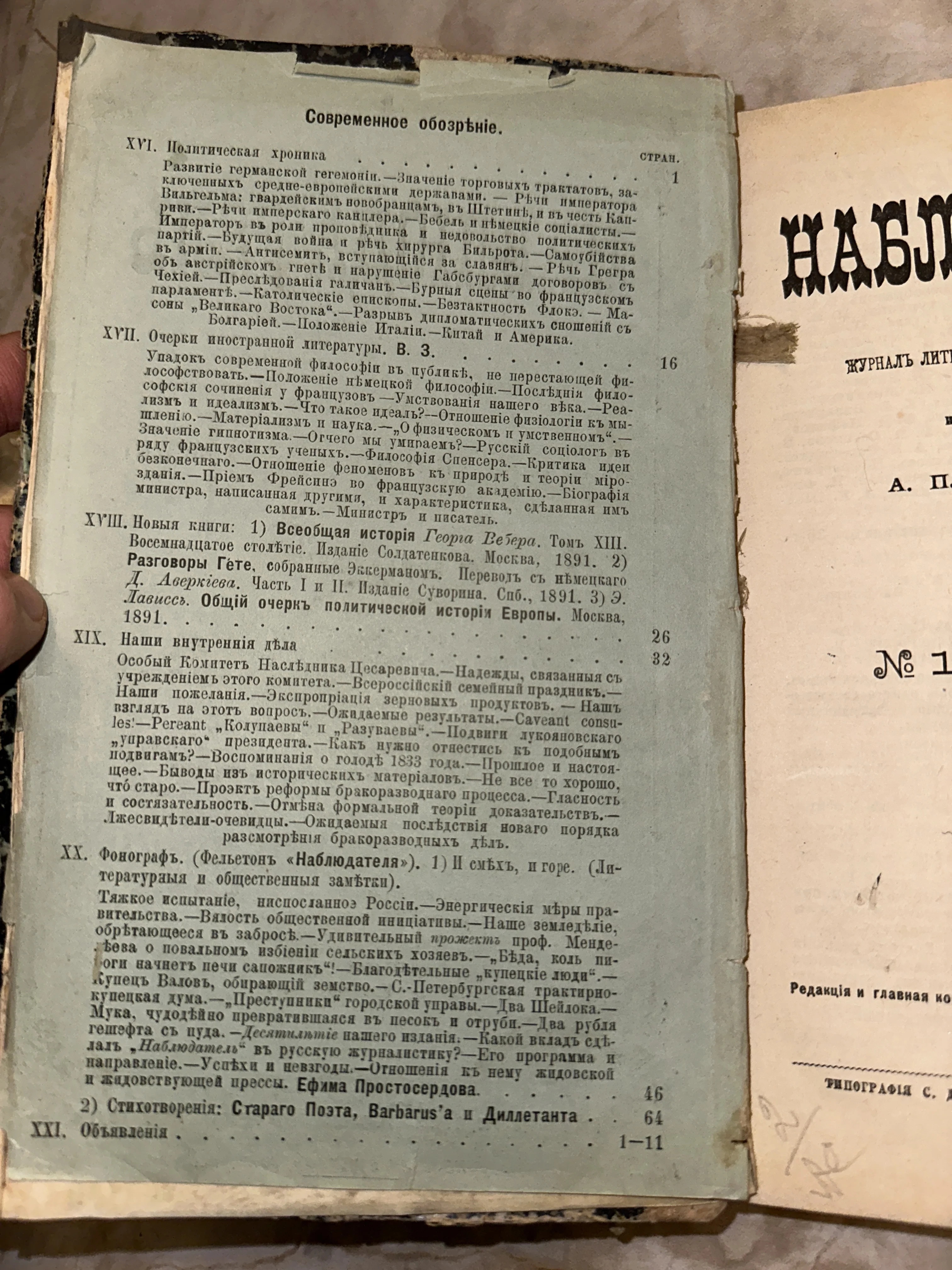 Оглавление литературного журнала «Наблюдатель», 1891 год