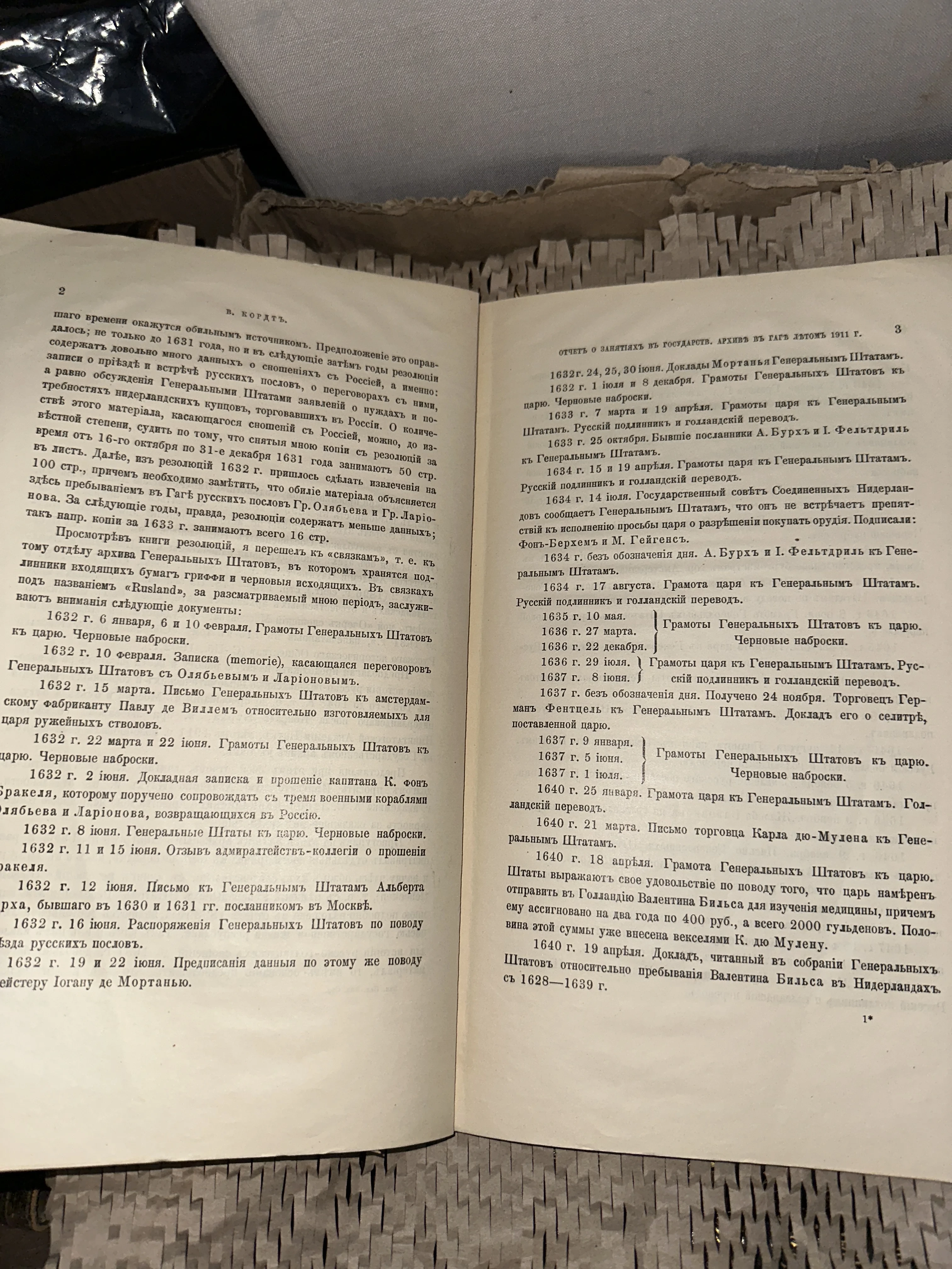 Исторический отчет В. Кордта об архивных документах в Гааге, 1911 год