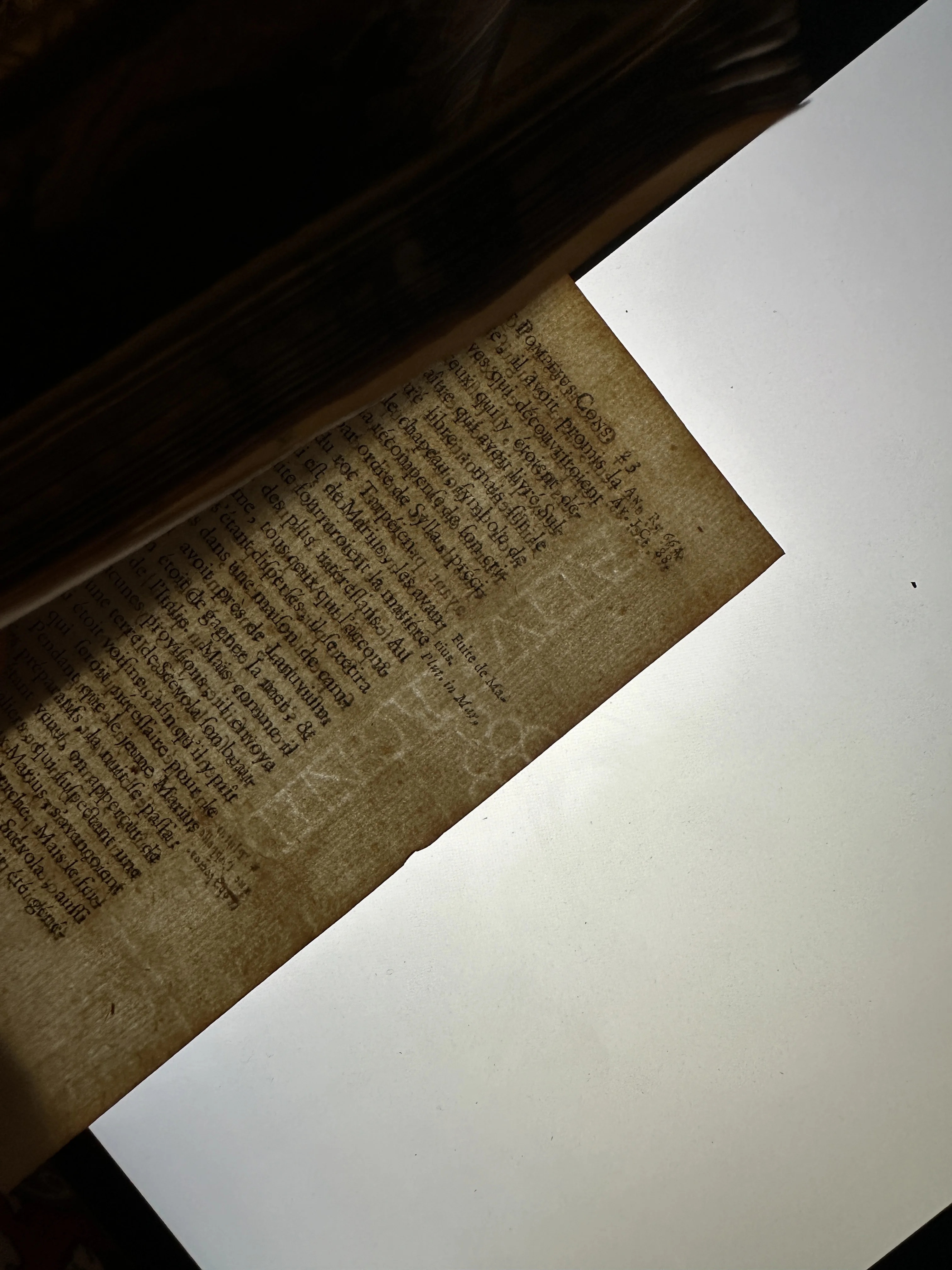 Крупный план пожелтевшей страницы старинной книги с французским текстом о Помпее и Сулле в драматичном освещении