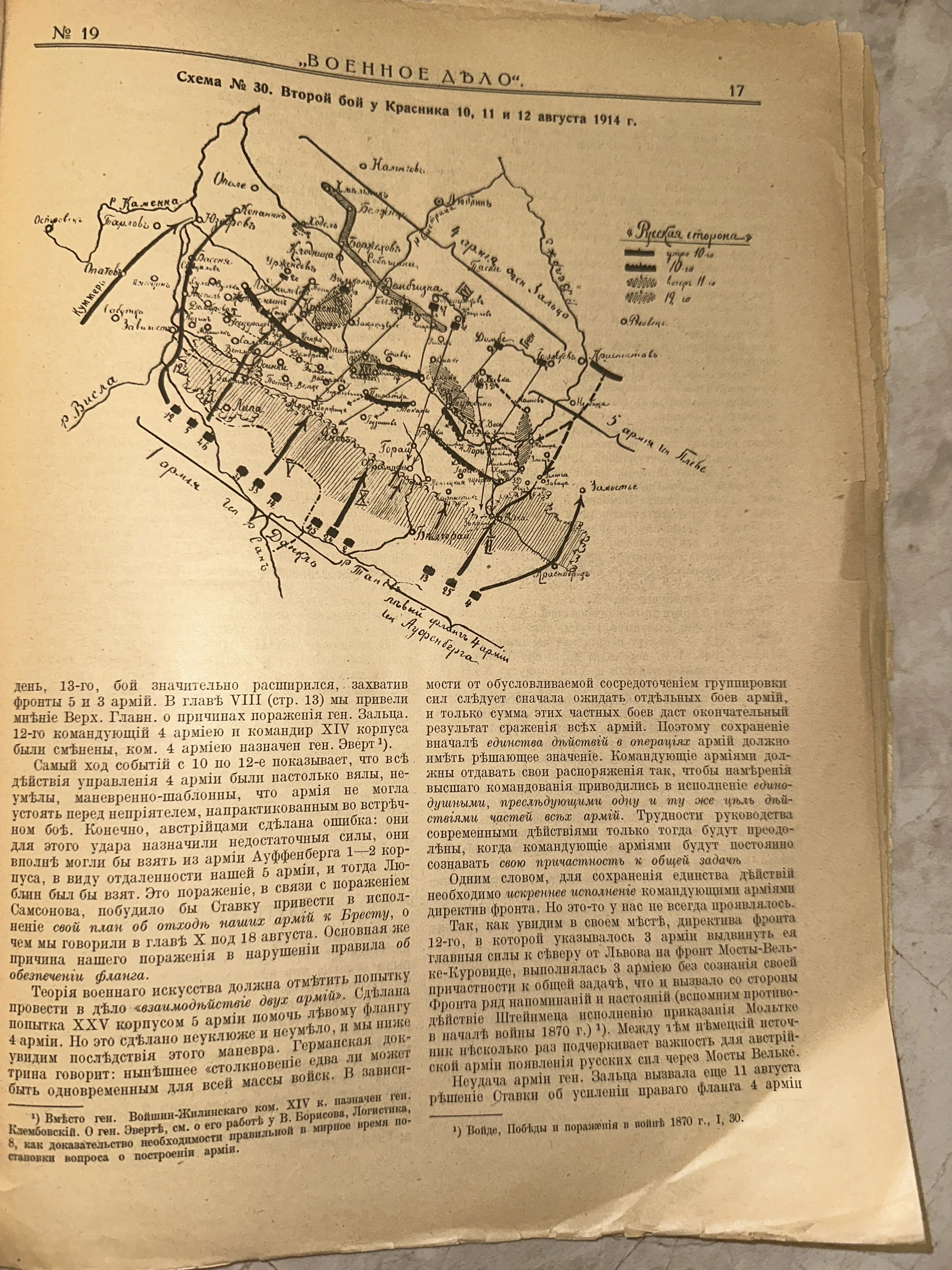Подлинная страница из военно-исторического издания, запечатлевшая детальный разбор тактических маневров в начале Первой мировой войны. Пожелтевшая бумага с четкой типографской печатью и детализированная схема позиций войск передают строгую атмосферу штабной работы столетней давности. Ценный артефакт для коллекционеров милитарии и исследователей истории русской армии.
