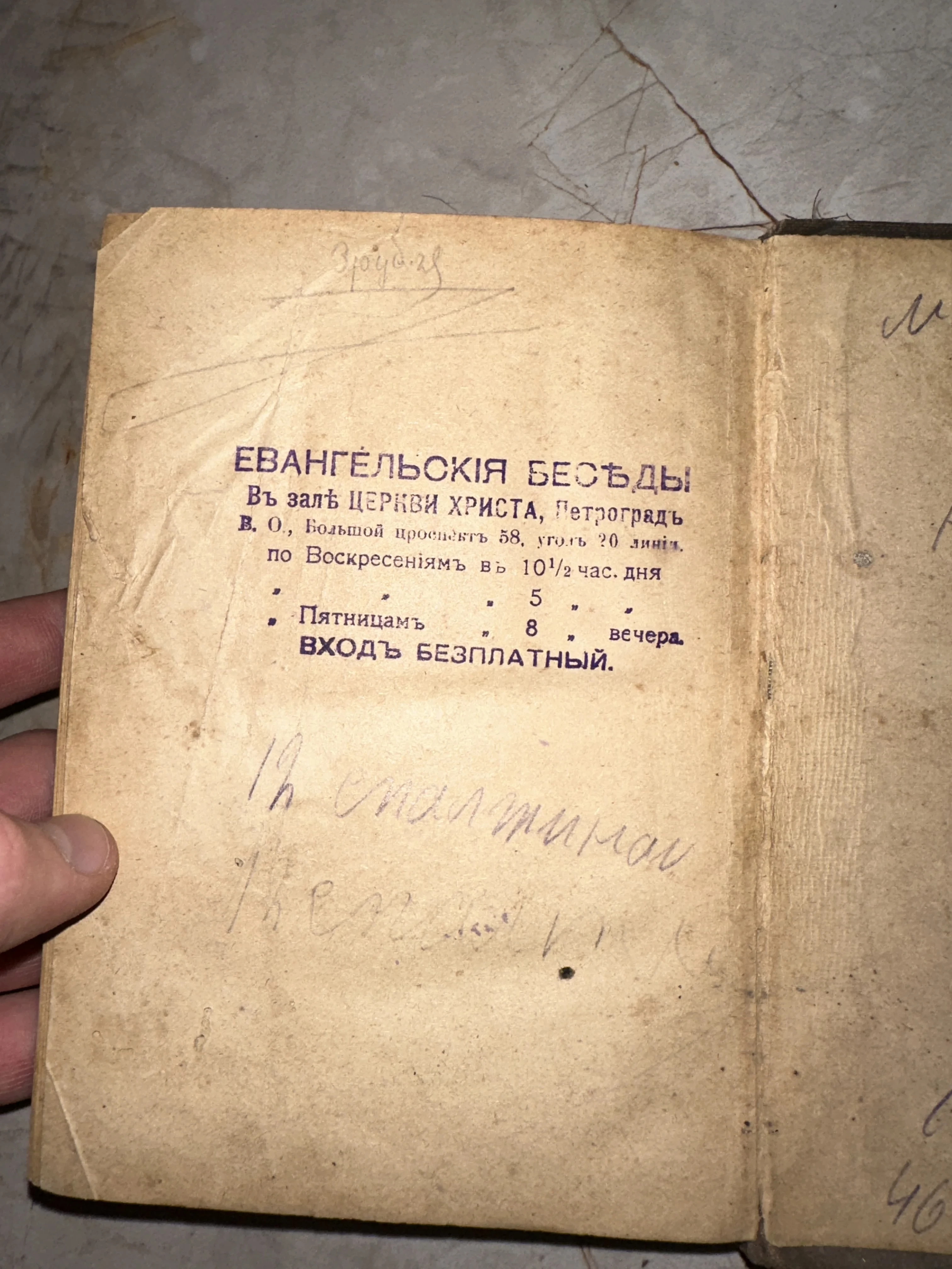 Редкое свидетельство духовной жизни Петрограда: штамп на форзаце приглашает на бесплатные евангельские беседы в Церкви Христа. Пожелтевшая от времени бумага с живыми карандашными пометками передает атмосферу эпохи и делает этот экземпляр уникальным объектом для изучения истории религии в России.