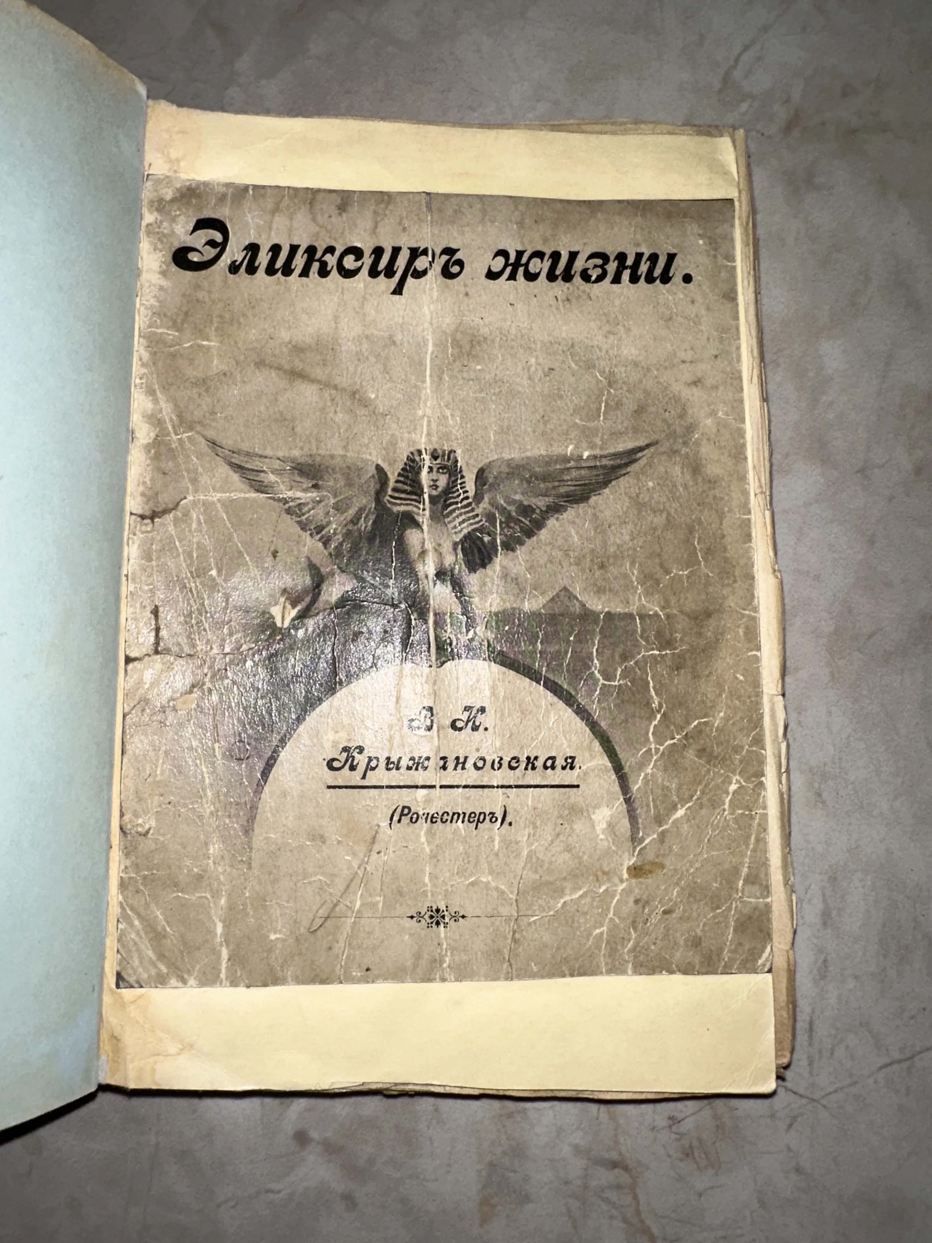 Титульный лист или обложка старинной книги «Эликсиръ жизни» В. И. Крыжановской с изображением крылатого сфинкса.