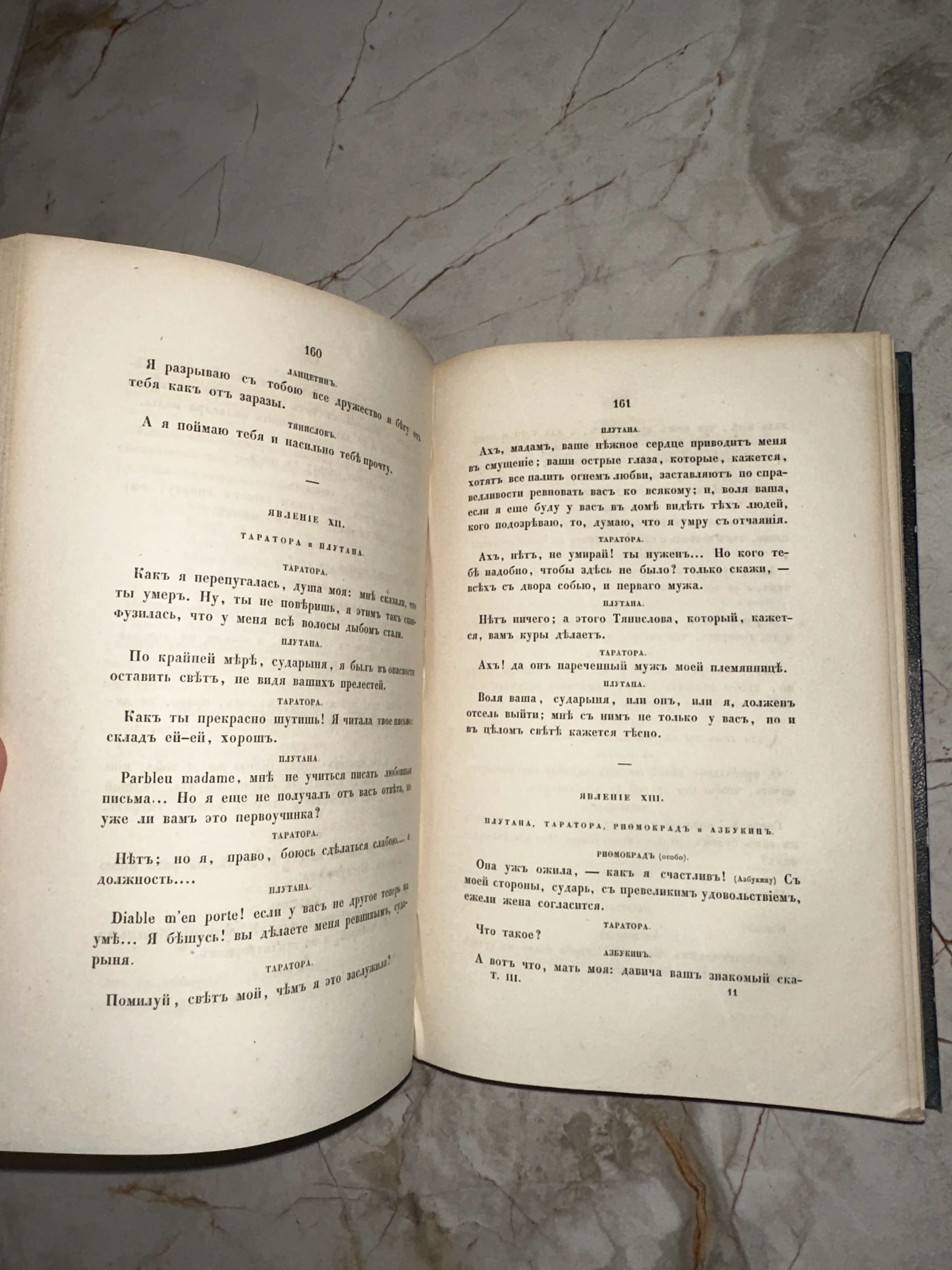 Уникальный фрагмент печатной истории, запечатлевший живой диалог комедийной пьесы на пожелтевшей бумаге с благородной патиной времени. Текст с использованием дореволюционной орфографии и четкая верстка подчеркивают аутентичность этого редкого издания XIX века. Книга станет изысканным дополнением библиотеки ценителя старинной драматургии и русской классики.