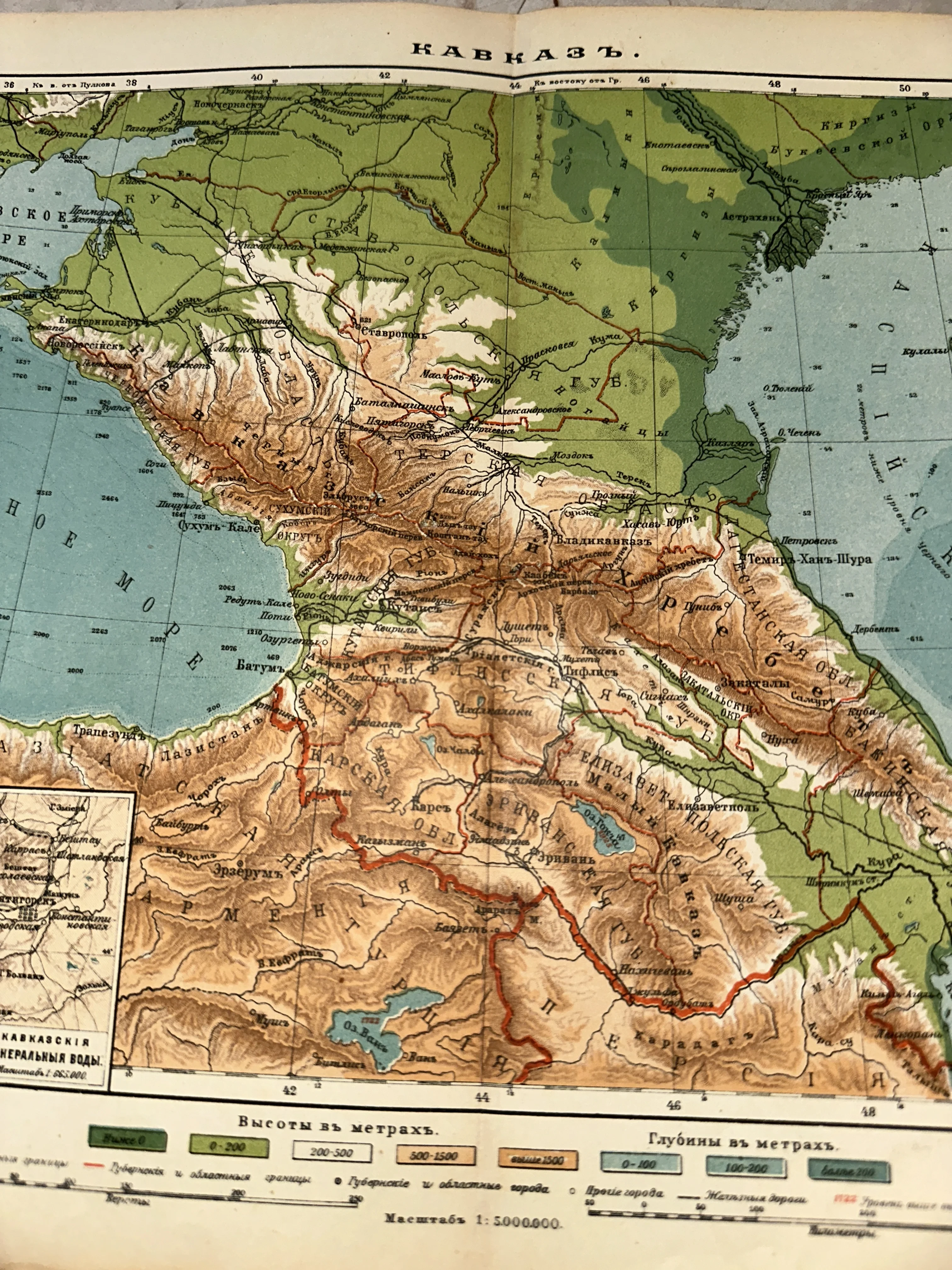 Старинная цветная физико-административная карта Кавказского региона с указанием высот, глубин и границ губерний.