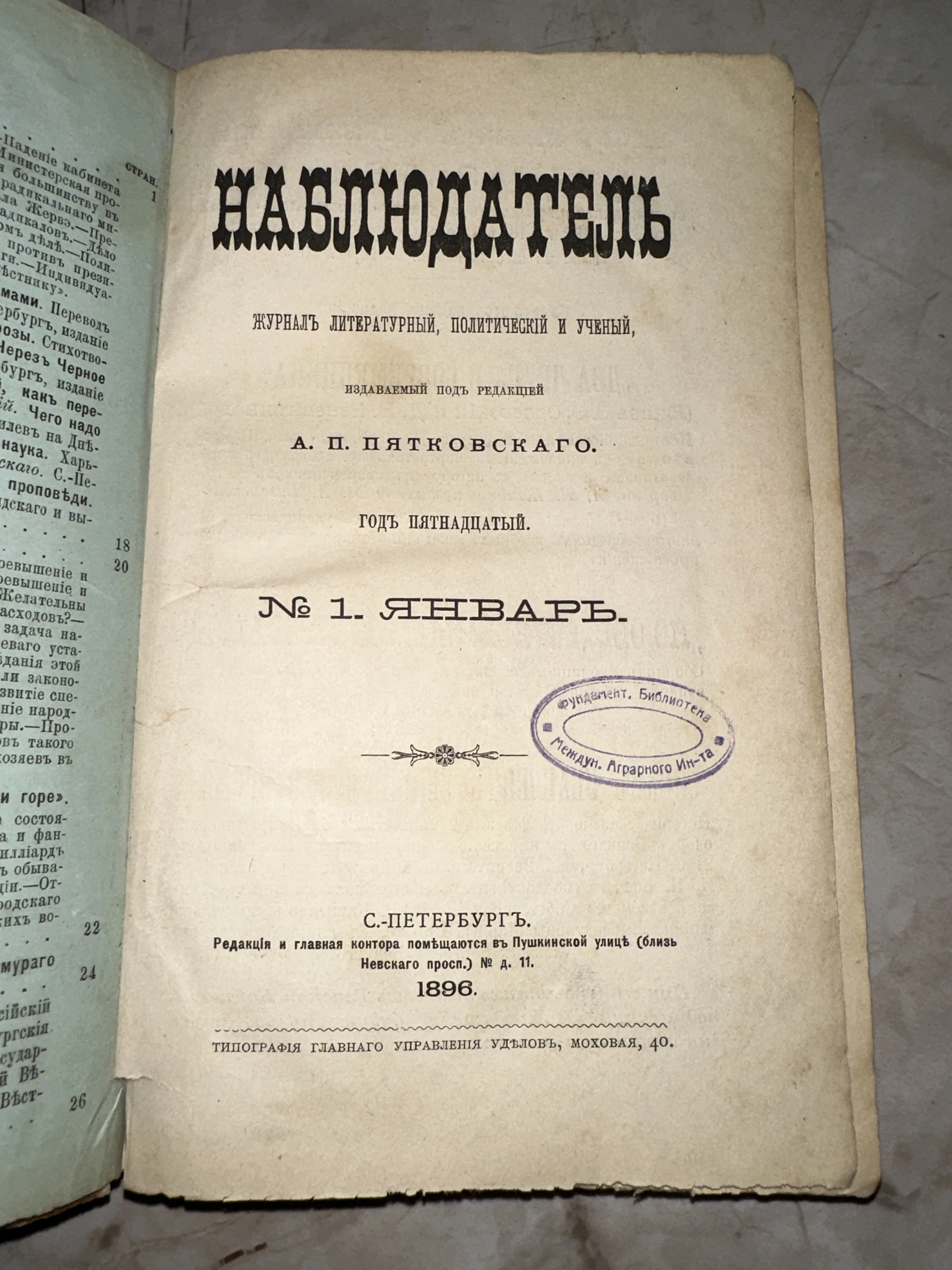 Литературный журнал «Наблюдатель», №1, январь 1896 года