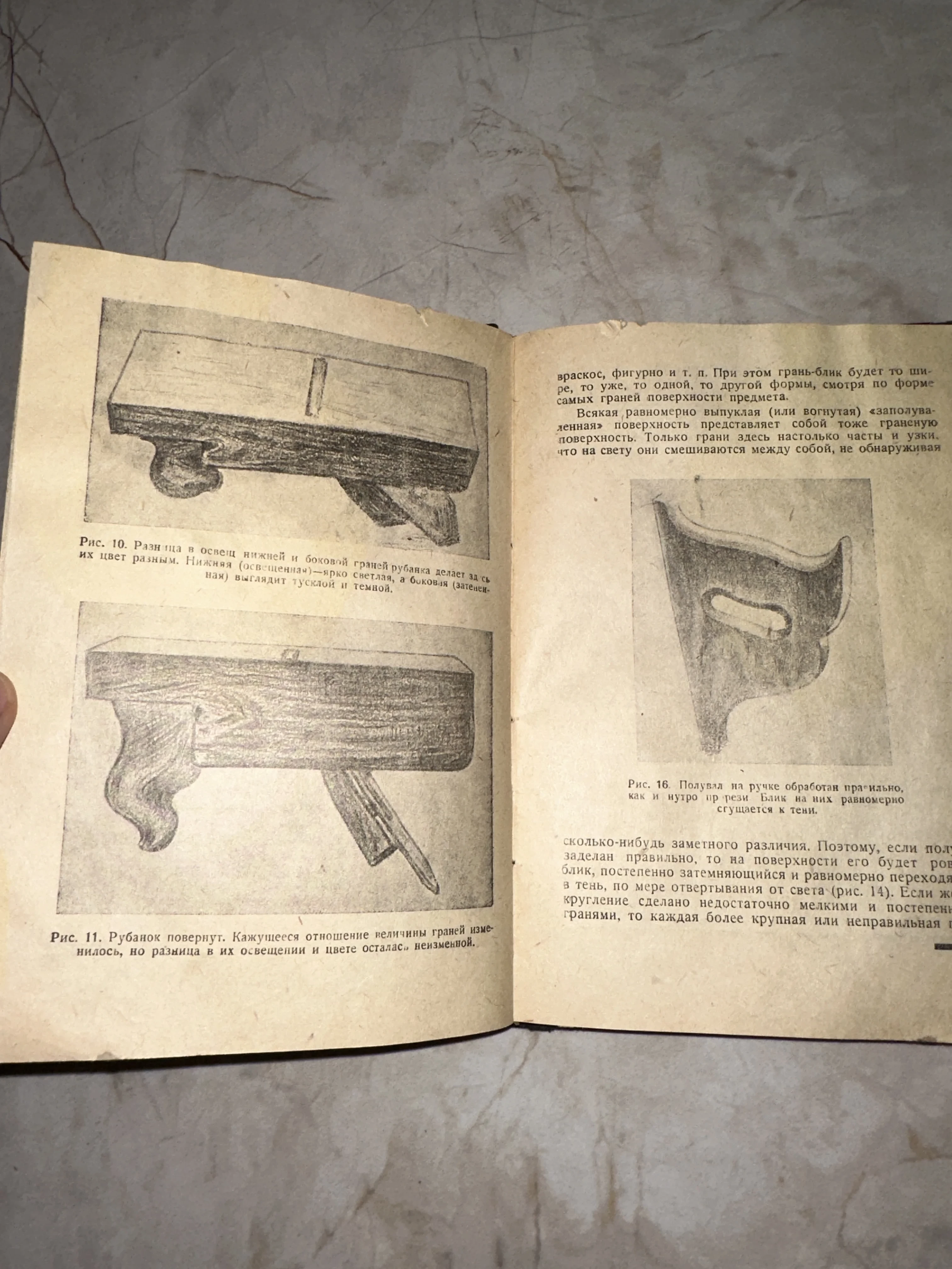 Аутентичный разворот технического или художественного пособия, детально объясняющий принципы передачи света и тени на предметах. Тонкая штриховка иллюстраций и характерная типографика прошлого века передают дух классической школы мастерства. Пожелтевшая от времени бумага с легкими следами бытования подчеркивает историческую ценность этого печатного экземпляра.