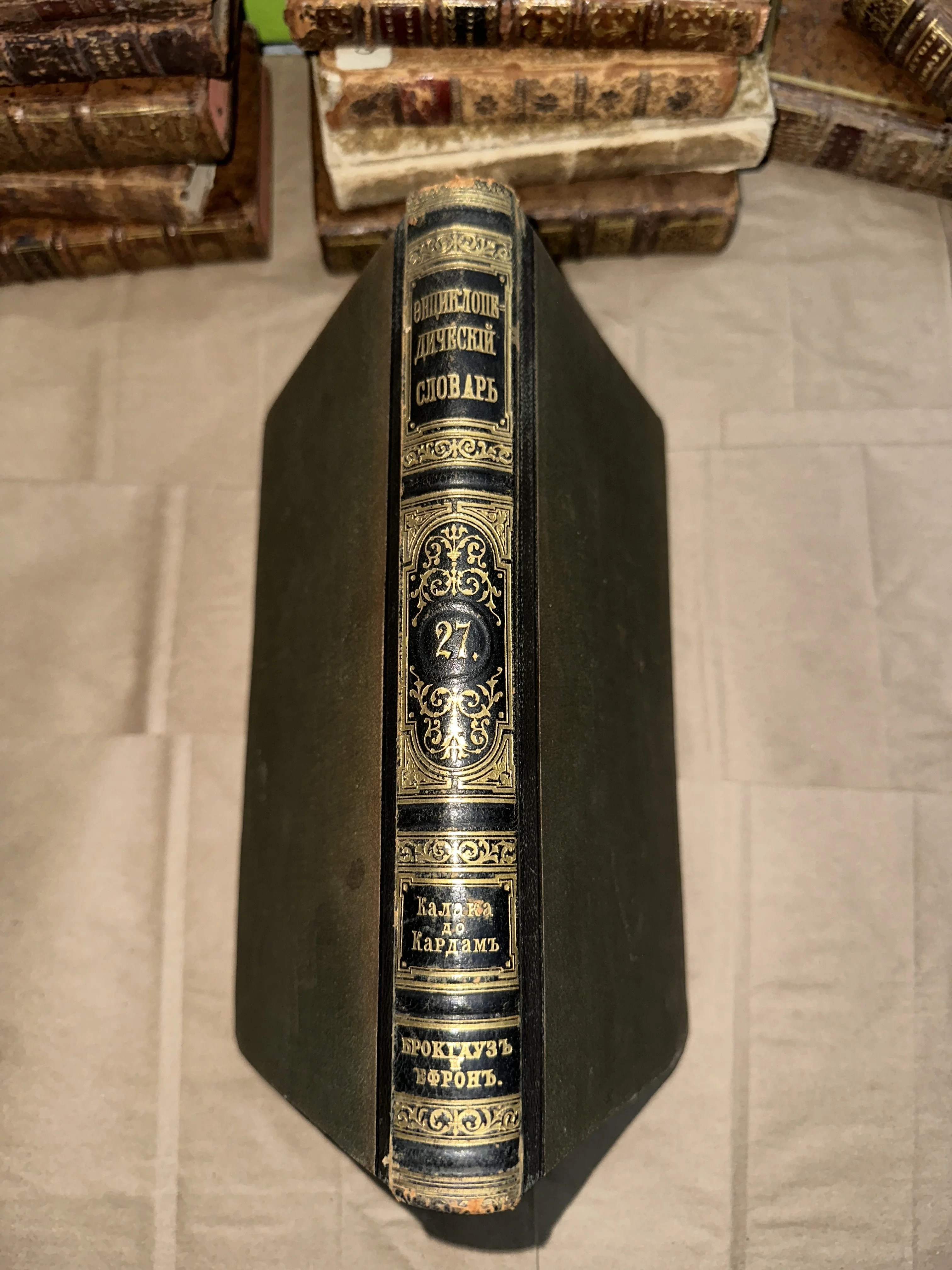 Корешок антикварной книги «Энциклопедический словарь Брокгауза и Ефрона», том 27, с богатым золотым тиснением на темной коже.