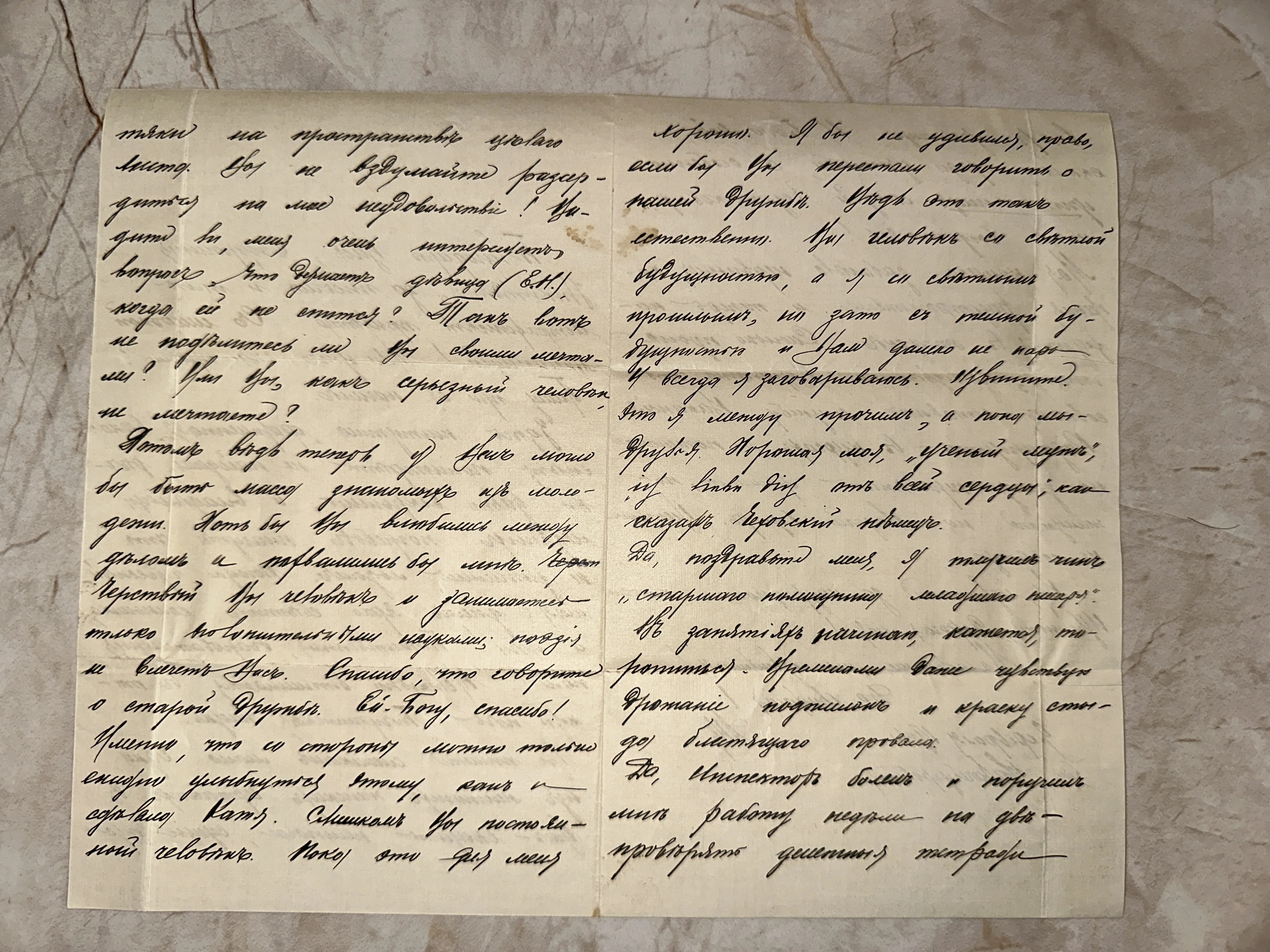Уникальный образец эпистолярного наследия начала XX века, написанный изящным беглым почерком. Бумага сохранила естественные следы времени, благородную желтизну и характерные складки, передающие атмосферу живой частной переписки прошлого. Текст, изобилующий личными обращениями и цитатами, представляет огромный интерес для историков и коллекционеров аутентичных документов.