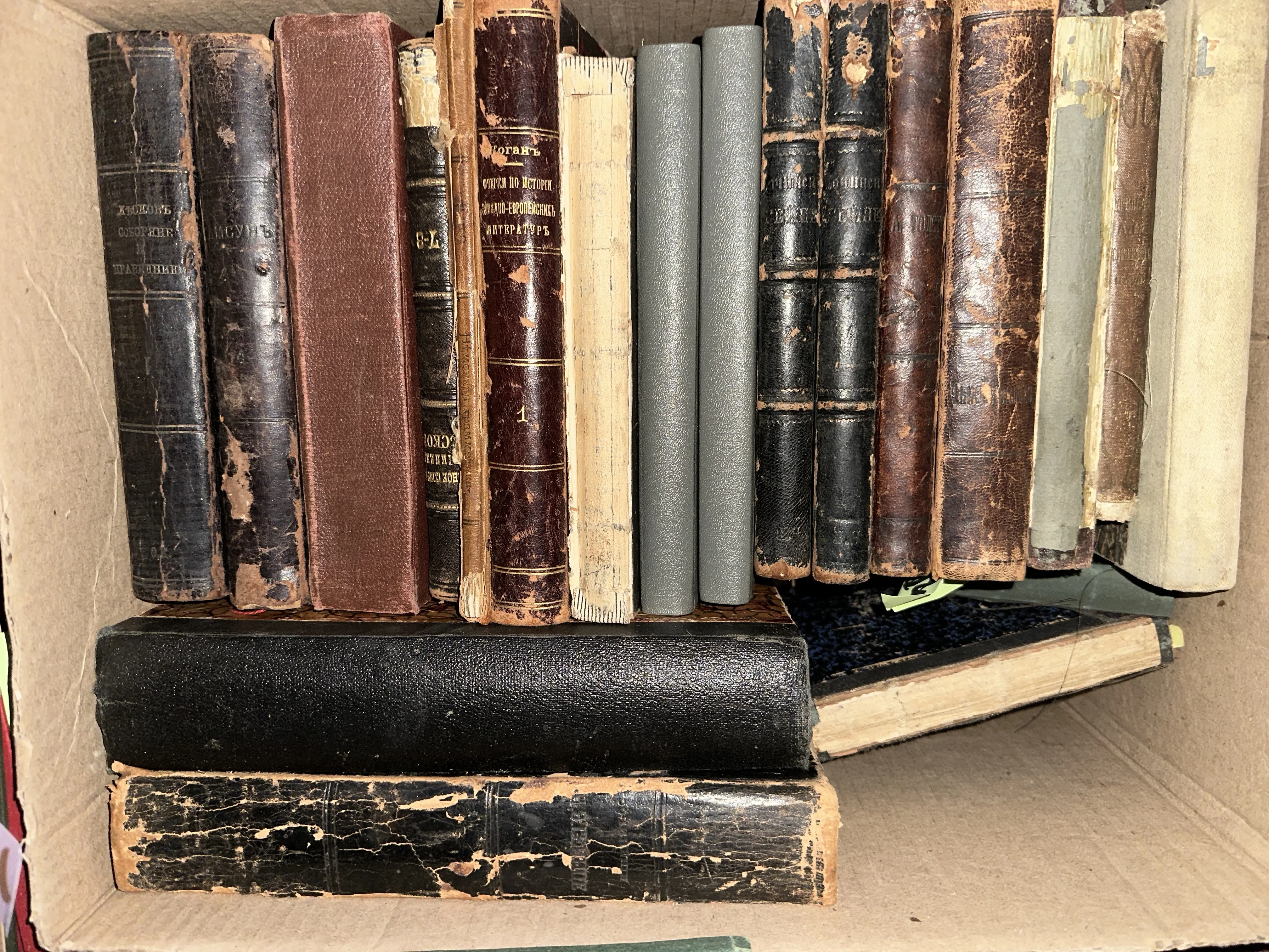 Старинные книги с потертыми кожаными и тканевыми корешками в картонной коробке.