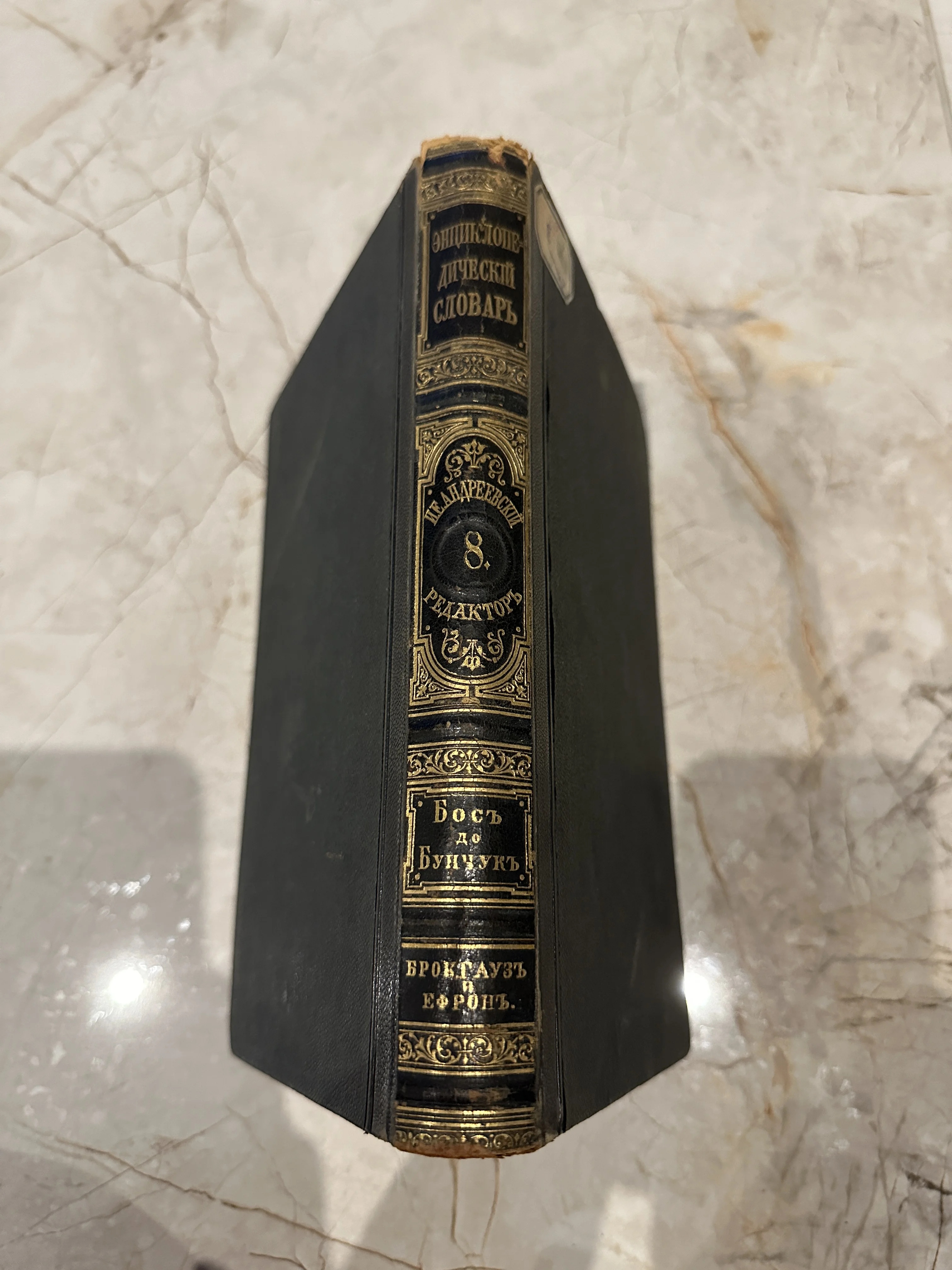Редкий восьмой том фундаментального энциклопедического издания Брокгауза и Ефрона, охватывающий статьи от «Бос» до «Бунчук». Изысканный черный корешок с богатым золотым тиснением и классическим орнаментом подчеркивает высокий статус дореволюционного книжного дела. Издание обладает ярко выраженной исторической атмосферой и станет достойным пополнением серьезной библиотеки.