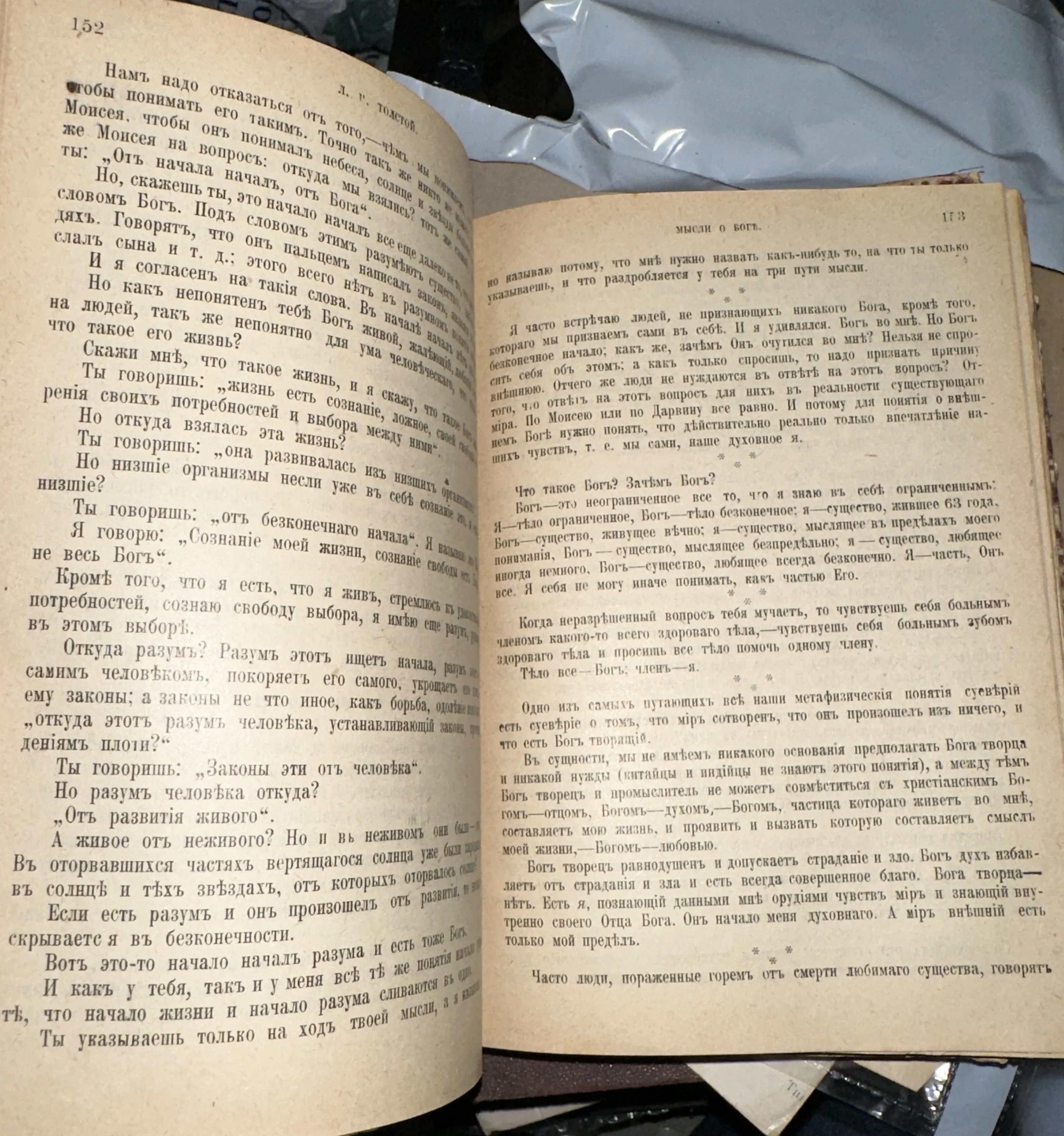 Этот редкий разворот старинного издания открывает читателю глубокие философские размышления Льва Толстого о природе божественного и человеческом разуме. Пожелтевшие страницы с дореволюционным шрифтом и характерными «ятями» создают неповторимую атмосферу интеллектуального поиска начала XX века. Книга сохранила очарование ушедшей эпохи и станет ценным приобретением для коллекционера русской классики.