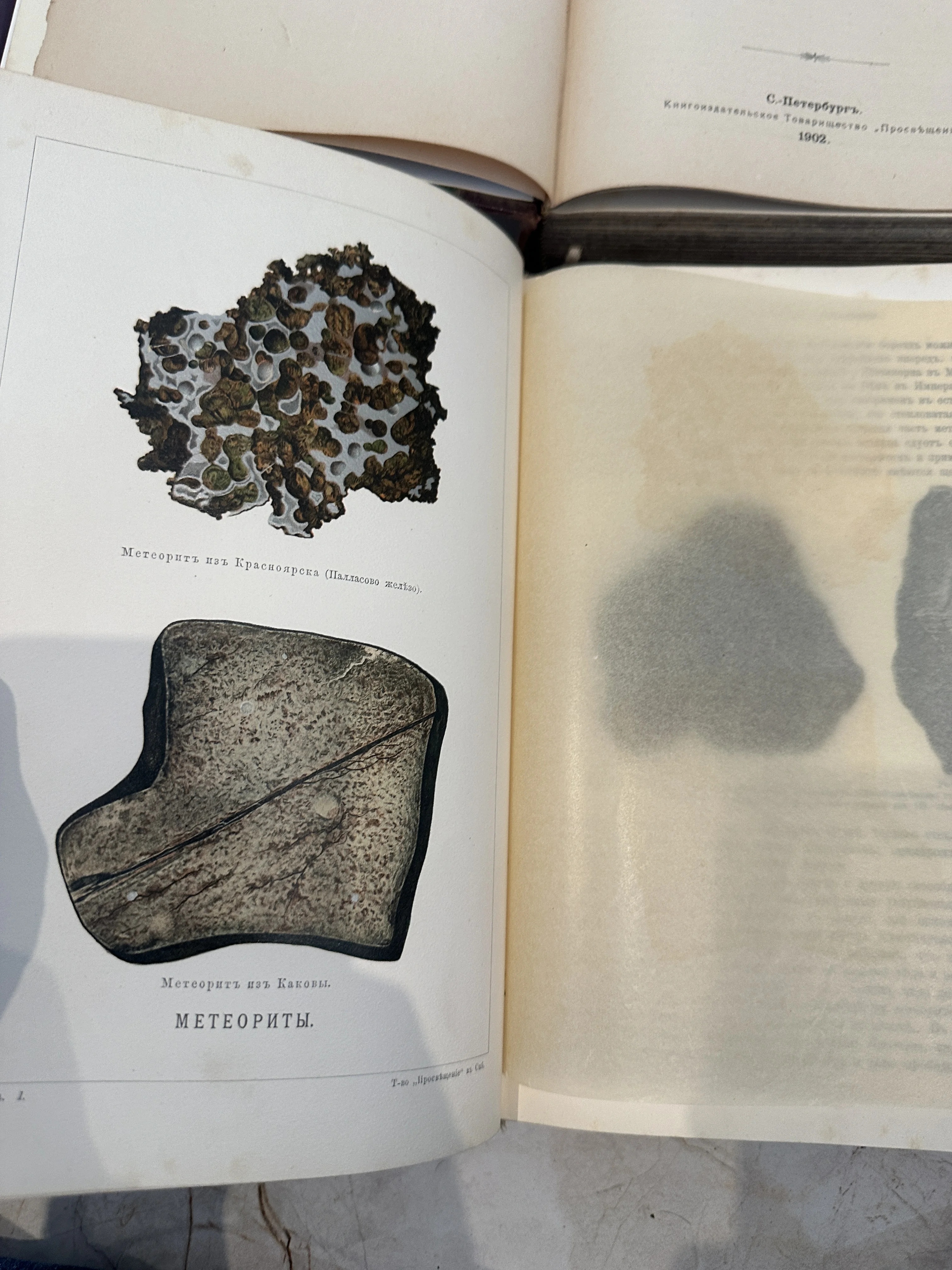 Уникальный разворот из научно-популярного издания книгоиздательского товарищества «Просвещение» с детальными изображениями внеземных минералов. Цветная печать превосходно передает сложную текстуру Палласова железа, а наличие оригинальной защитной кальки подчеркивает коллекционную сохранность артефакта. Эта иллюстрация — великолепный образец научной книжной графики дореволюционной России, представляющий огромный интерес для библиофилов и любителей астрономии.