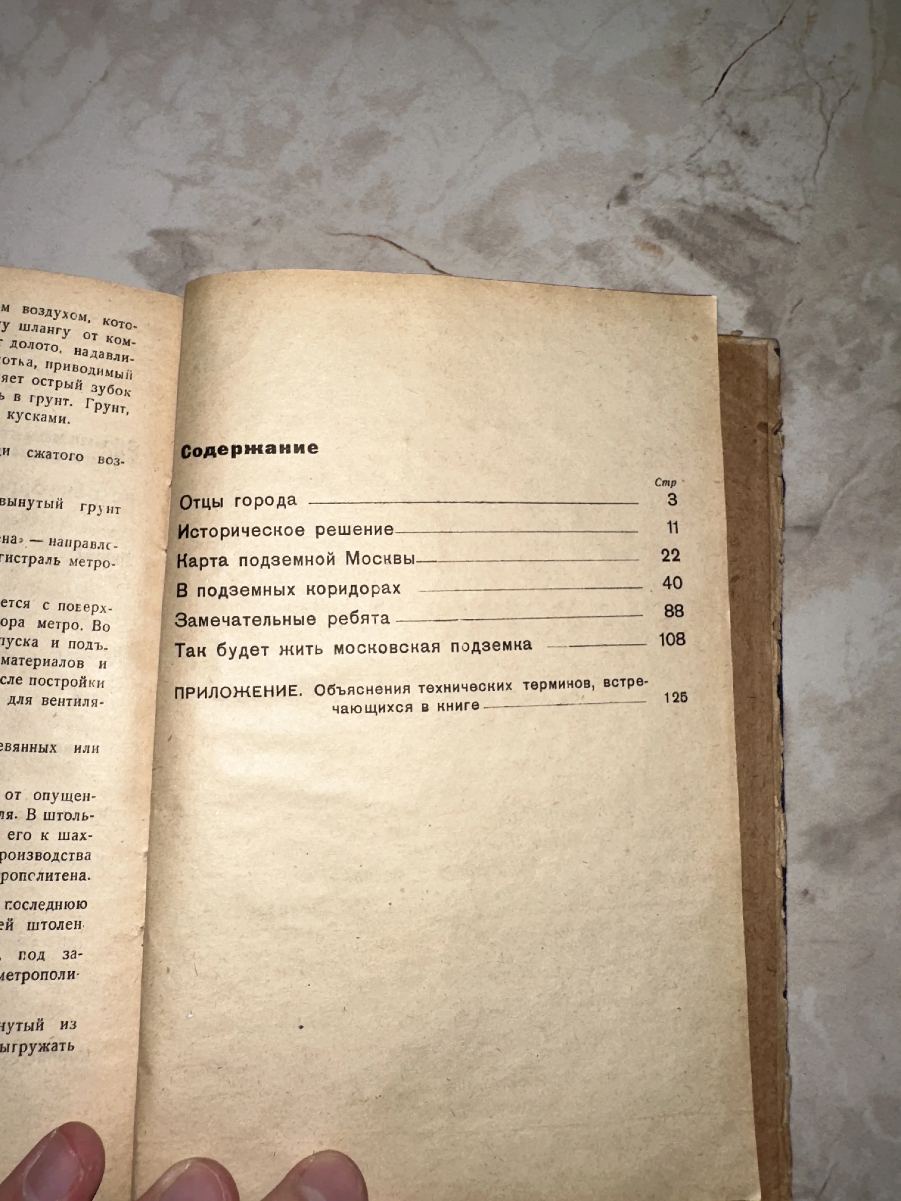 Фотография открытой старой книги на странице с оглавлением, содержащим главы о строительстве московской подземки.
