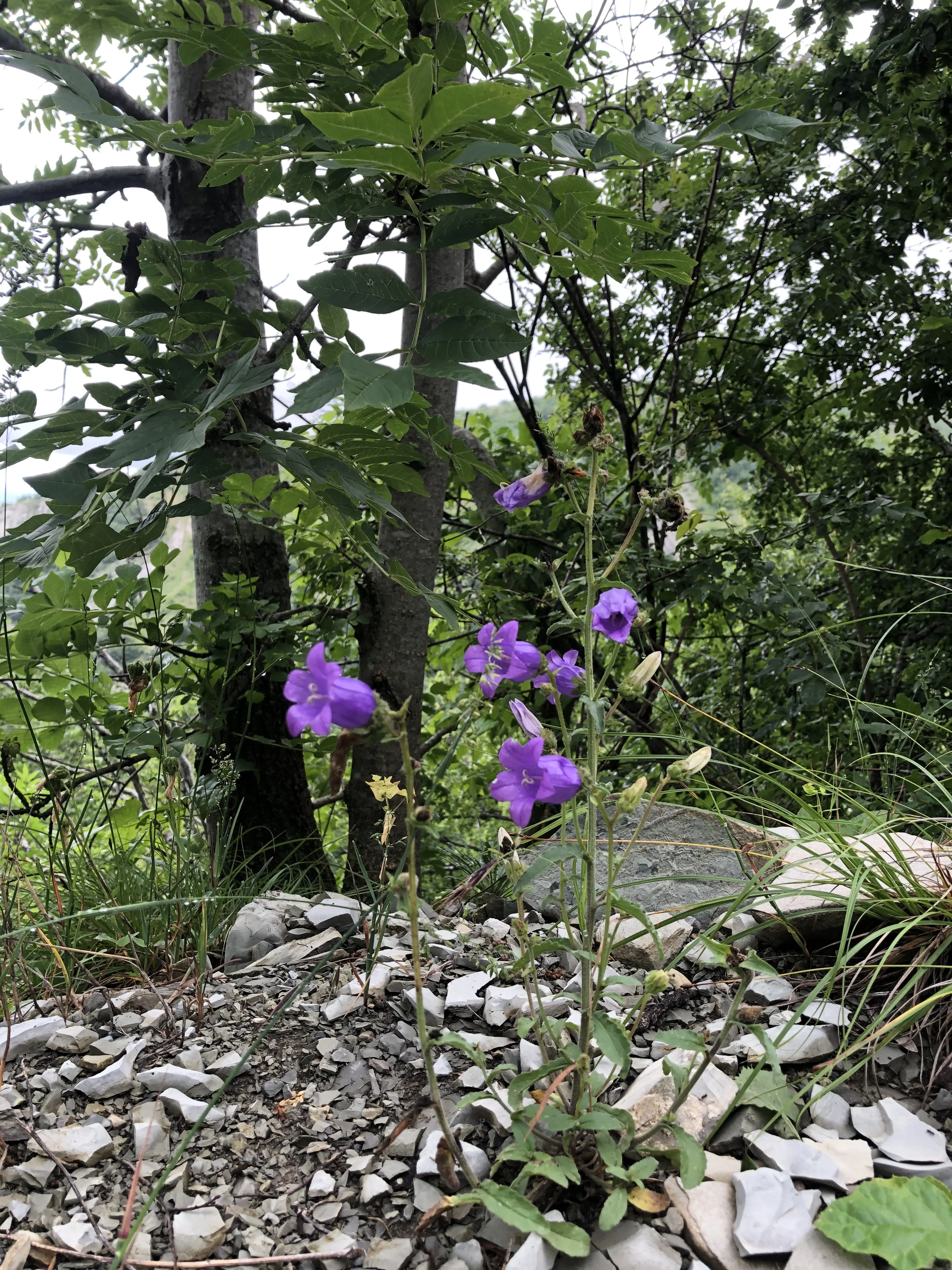 Изящные фиолетовые колокольчики эффектно контрастируют с суровой каменистой почвой горного леса. Снимок передает первозданную атмосферу дикой природы и хрупкое очарование цветов, пробивающихся сквозь скалы.