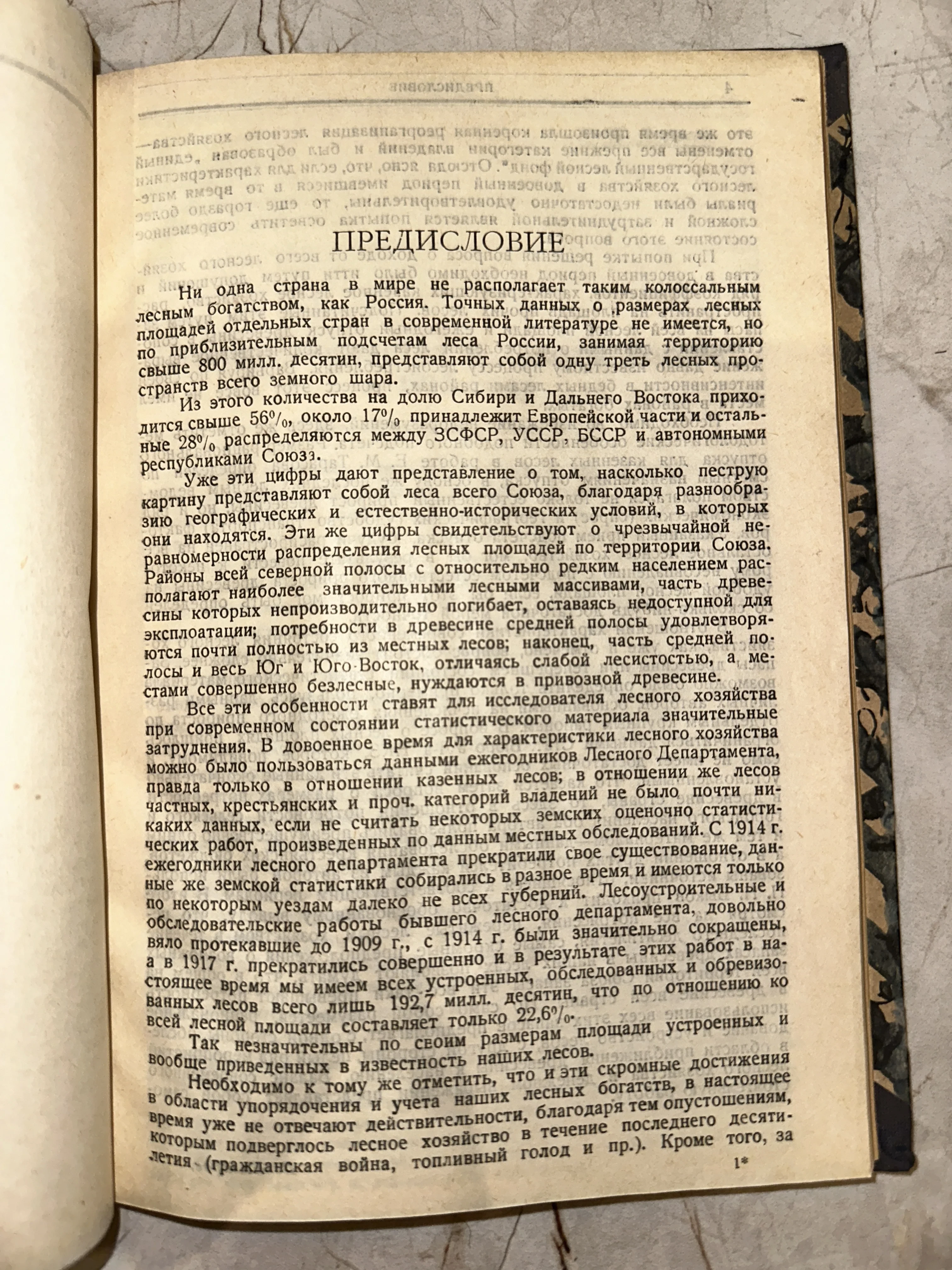 Раритетный экземпляр, представляющий глубокое исследование лесных ресурсов России и республик Союза начала XX века. Текст на пожелтевшей плотной бумаге сохранил четкость типографской печати, передавая атмосферу научного поиска и статистической точности той эпохи. Прекрасная находка для коллекционеров литературы по экономике, географии и истории природопользования.