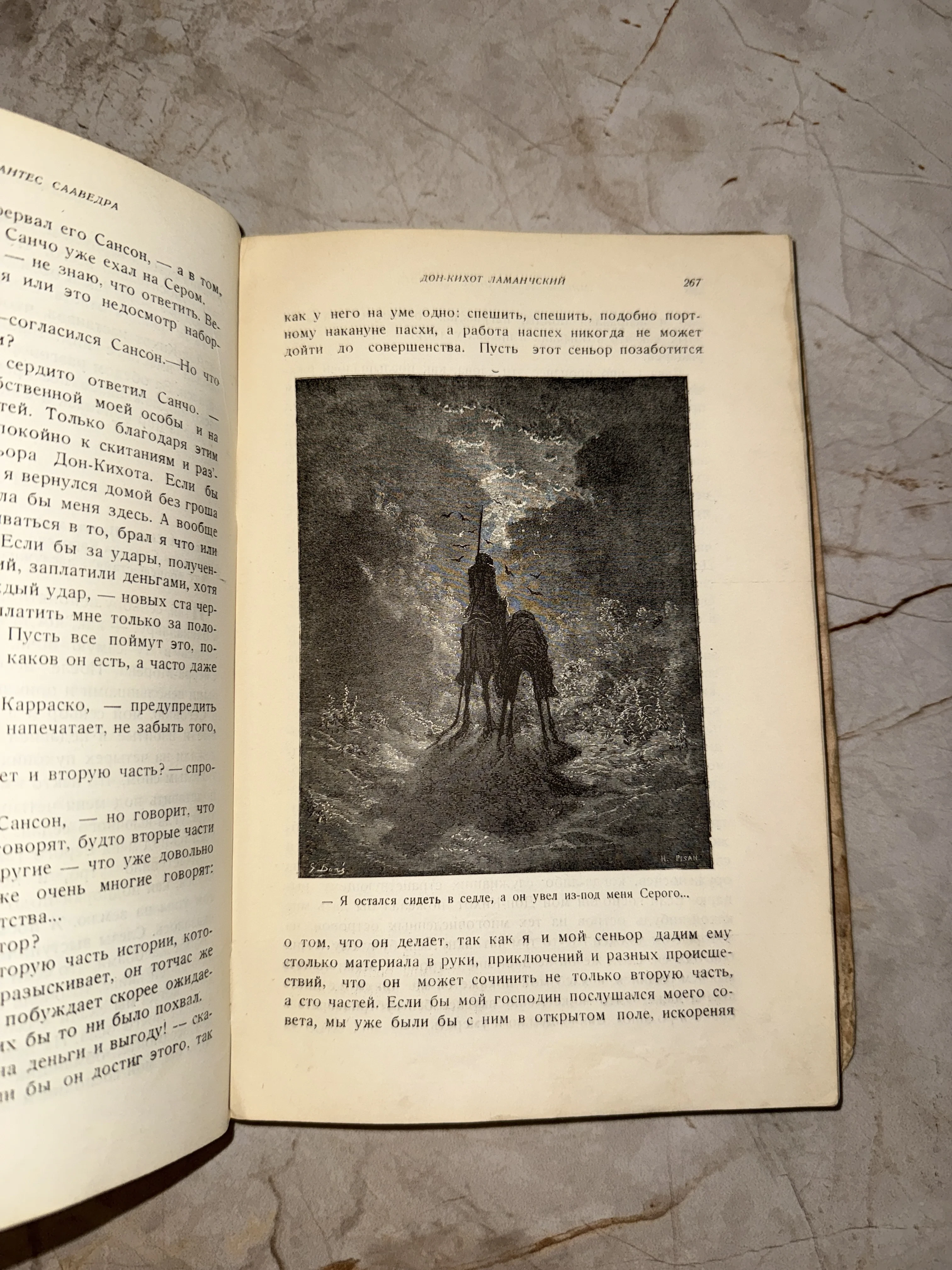 Классическое издание бессмертного романа Сервантеса, украшенное знаменитой графикой Гюстава Доре. На странице представлена атмосферная гравюра, передающая одиночество и величие странствующего рыцаря под лунным небом. Состояние бумаги с легким благородным пожелтением придает книге особый антикварный шарм и историческую достоверность.