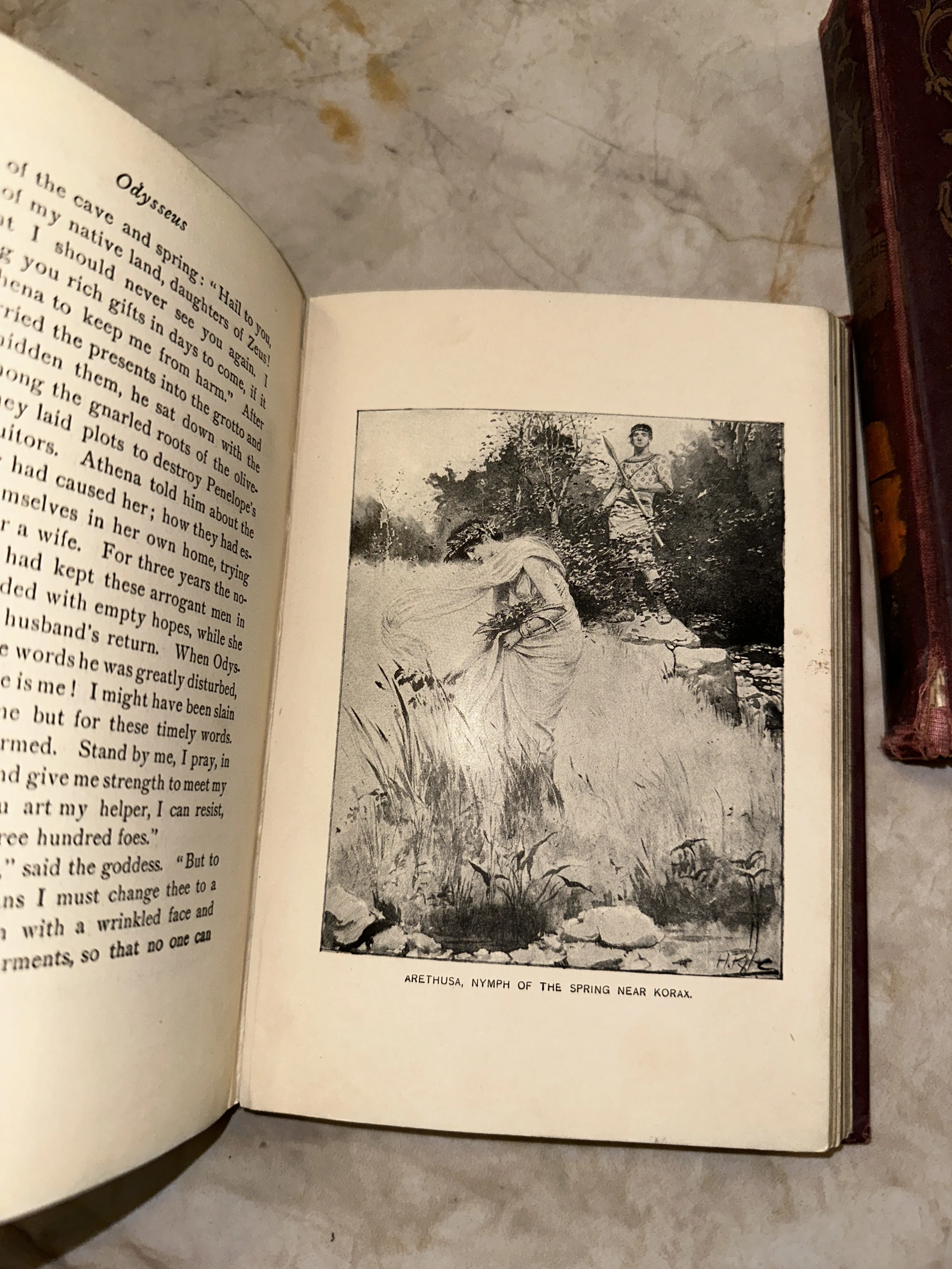 Изысканный разворот антикварного издания, посвященного греческой мифологии, с детальной черно-белой иллюстрацией нимфы Аретузы. Желтоватая патина страниц и классическая типографика подчеркивают почтенный возраст книги, делая её ценным экземпляром для коллекционера исторической литературы. Тонкая работа иллюстратора передает мистическую атмосферу древних легенд и мастерство книгопечатания прошлого.