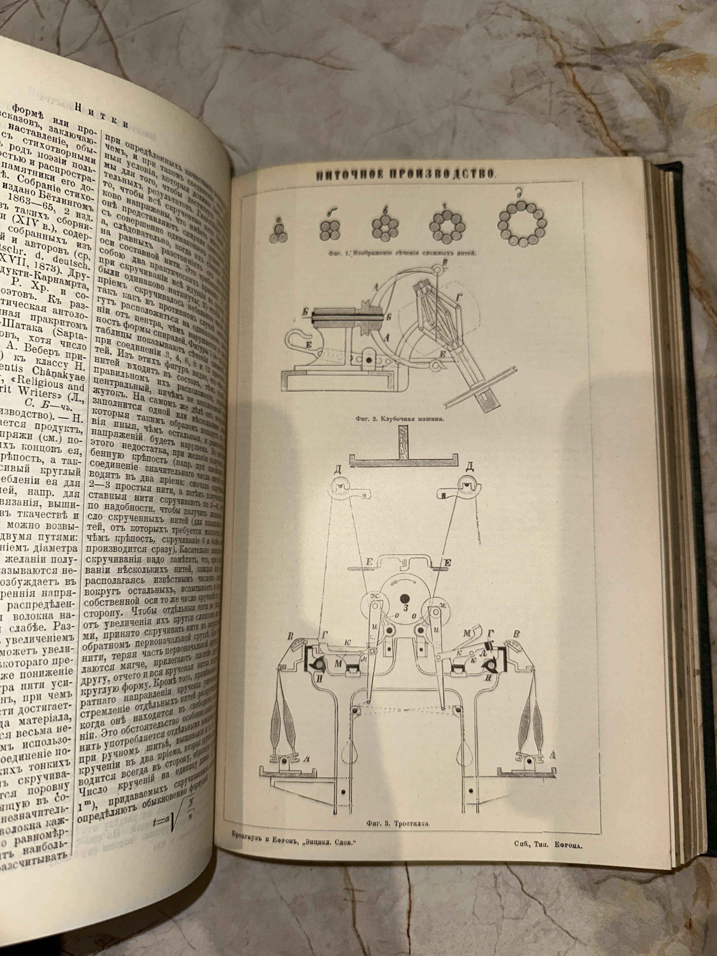 Иллюстрированный разворот из знаменитого энциклопедического словаря Брокгауза и Ефрона, представляющий детальные схемы станков XIX века. Четкая типографская печать на плотной состаренной бумаге передает атмосферу индустриальной эпохи и высокое качество дореволюционной полиграфии. Идеальный образец технической графики, который станет украшением коллекции редких изданий.