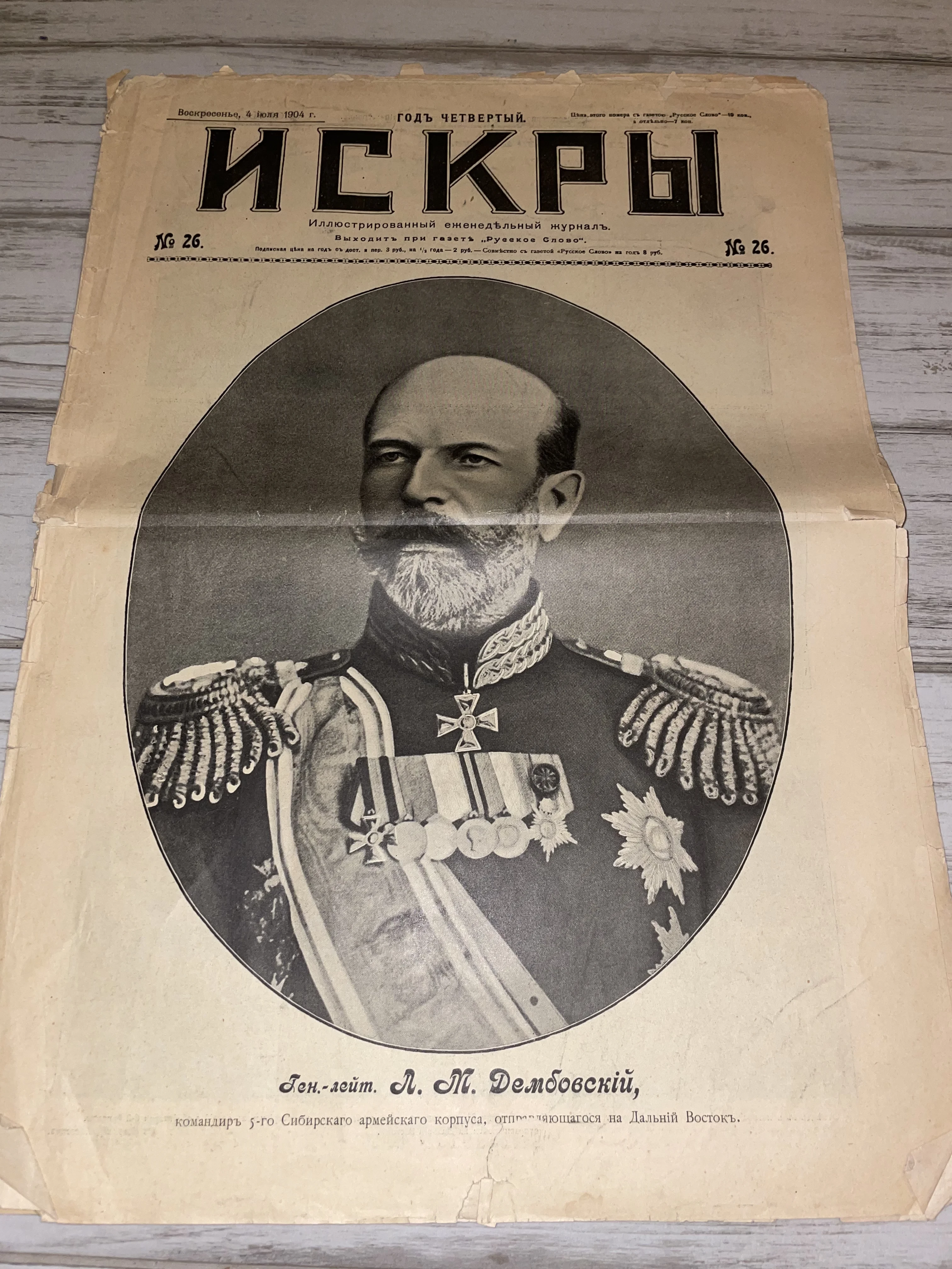 Обложка антикварного журнала Искры за 1904 год с портретом генерал-лейтенанта Л. М. Дембовского в военной форме с медалями.