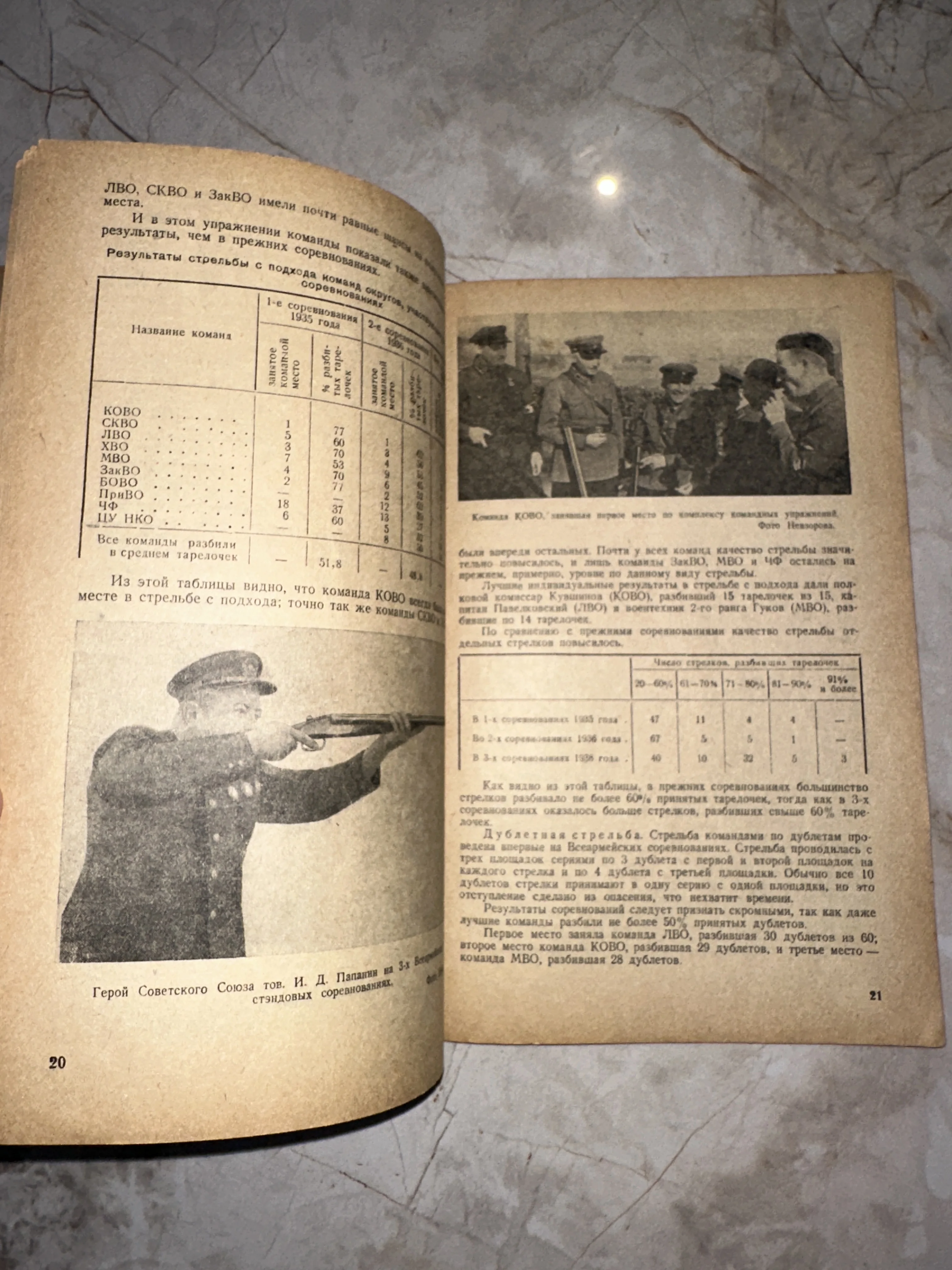 Редкий разворот антикварного издания, посвященного истории советского стрелкового спорта и военно-окружных соревнований 1935–1936 годов. На страницах запечатлен Герой Советского Союза И. Д. Папанин на огневом рубеже, а аутентичная типографика и пожелтевшая от времени бумага передают строгую атмосферу довоенной эпохи. Коллекционный экземпляр с отличной сохранностью текста и иллюстраций.