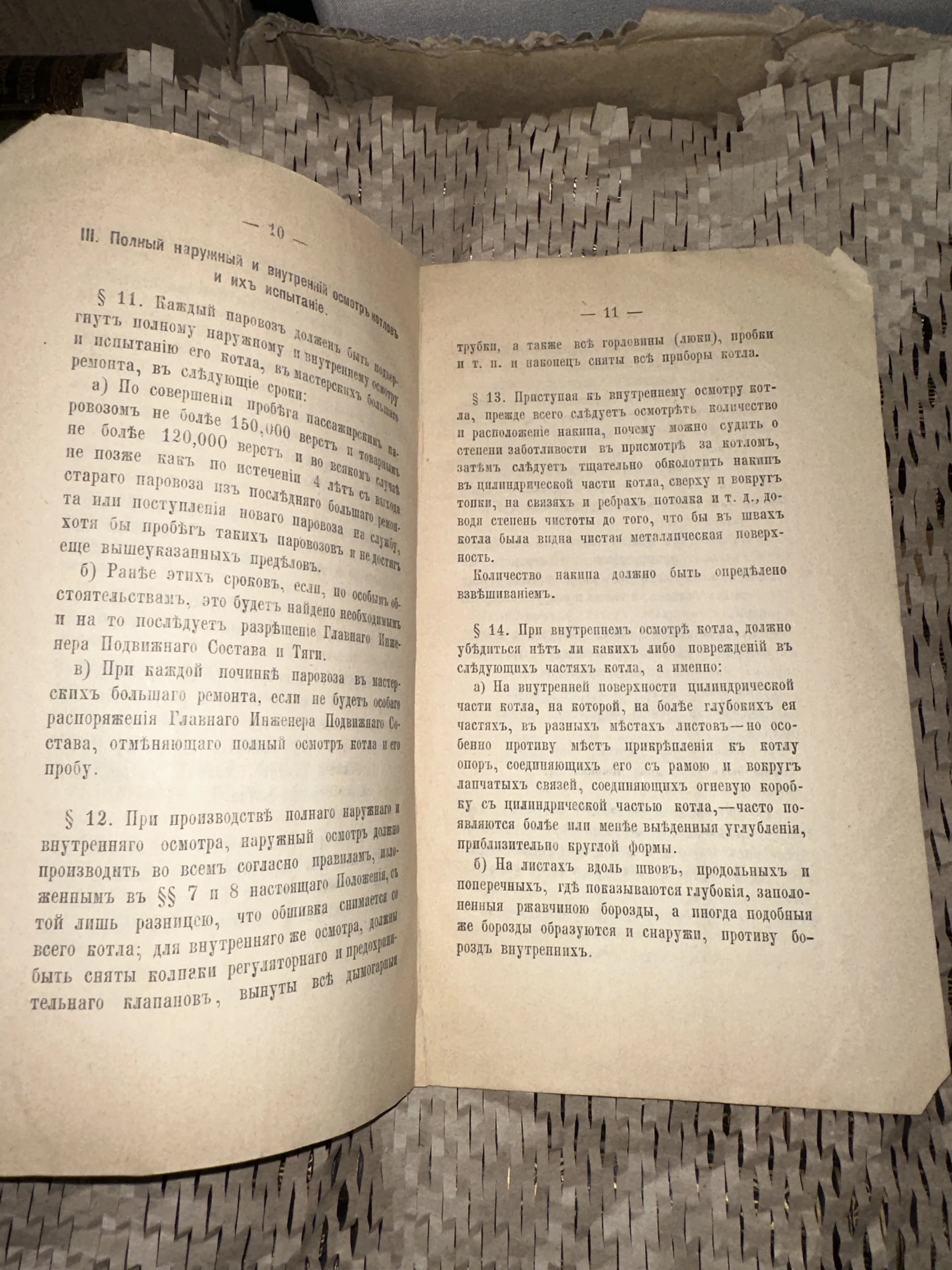 Редкий образец технической литературы начала XX века, детально описывающий регламент обслуживания железнодорожной техники. Пожелтевшие страницы с четким типографским шрифтом и характерной орфографией того времени передают подлинную атмосферу индустриальной эпохи. Настоящая находка для коллекционеров, увлеченных историей железных дорог и старинными инженерными изданиями.