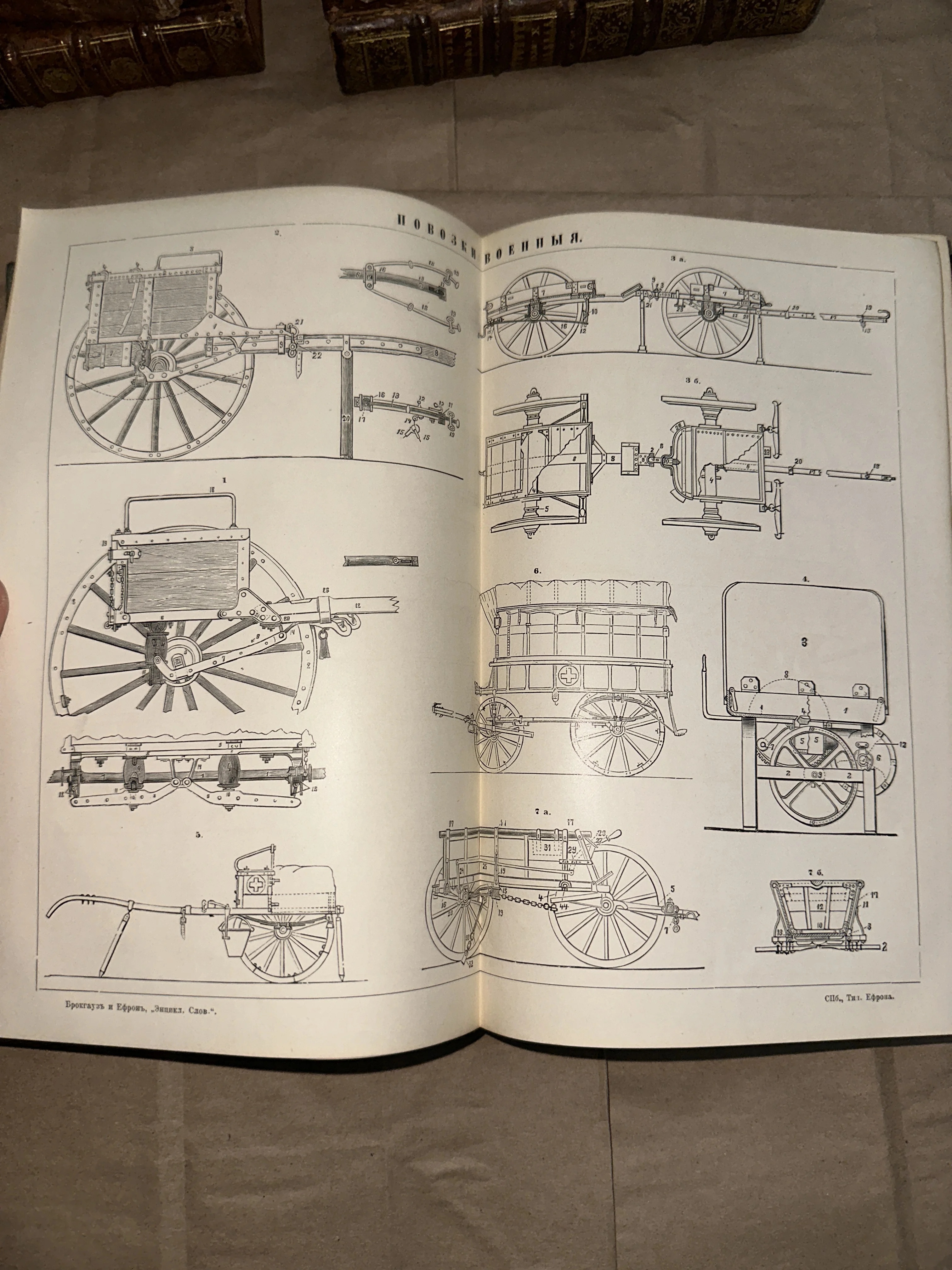 Уникальный оттиск из легендарного словаря Брокгауза и Ефрона, демонстрирующий мастерство технической иллюстрации конца XIX века. На странице представлены детализированные схемы военно-полевых транспортных средств и медицинских фургонов с подетальной нумерацией узлов. Четкость печати и превосходная сохранность бумаги делают этот лист ценным приобретением для коллекционеров военной истории и старинной графики.